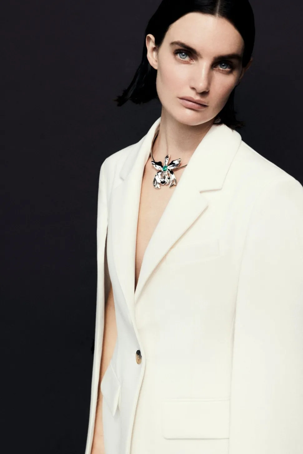 Founded in 2016 by sisters Marina and Francesca Moscone, the label gravitates toward a tactile approach, twisting and draping fabrics by hand to create a softly seductive design using custom jacquards, fil-coupés, and silk wools, all exclusively developed in Italy, rendered in precise shapes and tailoring. The Silver Orchid Choker captures the brand’s sculptural elegance with a botanical silhouette cast in palladium silver-plated brass and accented by a single malachite bead for a refined, organic touch.
