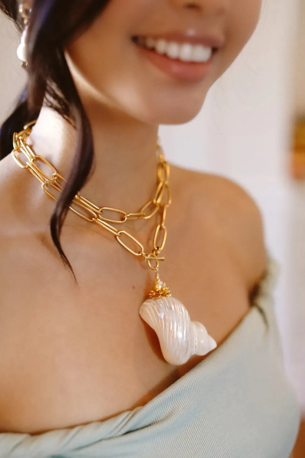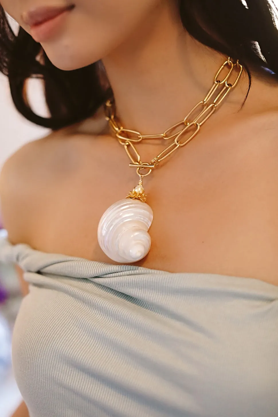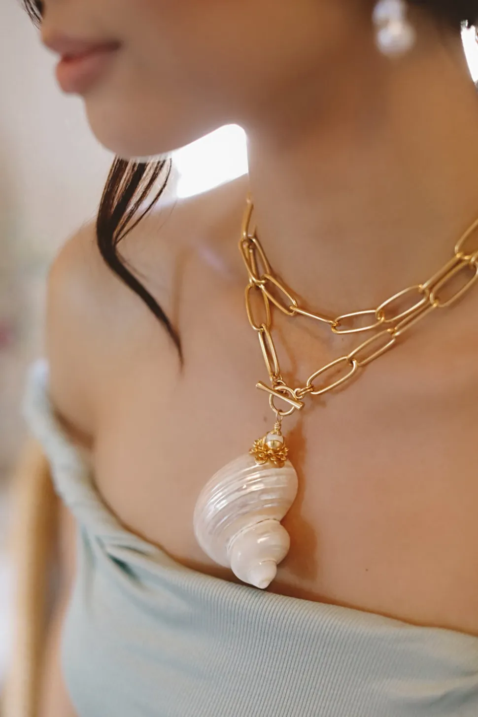 The mother-daughter duo behind Brinker + Eliza combine their experience in metalsmithing and fashion to create incredibly unique jewelry that feels custom-made. Employing pearls, shells, and earth’s most prized organic forms, these are pieces to be not just worn but treasured. The Sirena Necklace features a stunning large polished Pearl Turbo Shell that will draw the eye. Style the 24K antique gold-plated paperclip chain two ways: doubled as a close-to-the-neck necklace or singled as a long necklace.