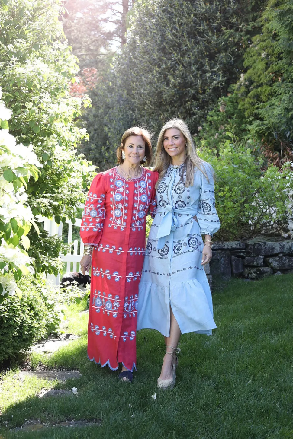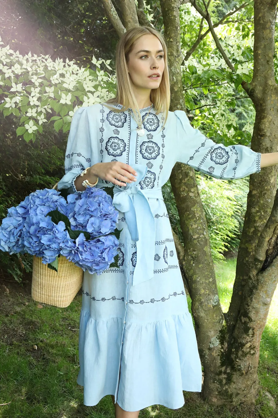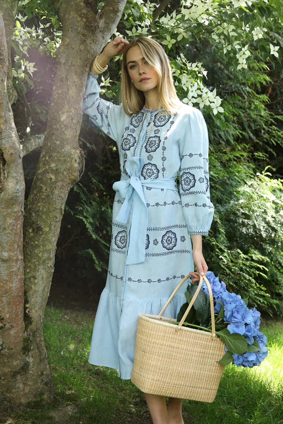 Inspired by art, architecture and the founder’s global journeys, ASHA by Ashley McCormick introduces bold, sophisticated jewelry and accessories made from only the finest materials. From everyday glamour to the red carpet, these statement pieces are classic additions to your collection. The Sky Amelie Dress channels vintage French romance in soft sky blue linen, detailed with intricate navy dotted floral embroidery. With a tea-length silhouette, snap closures, and a coordinating tie belt, this airy piece blends timeless femininity with effortless polish.