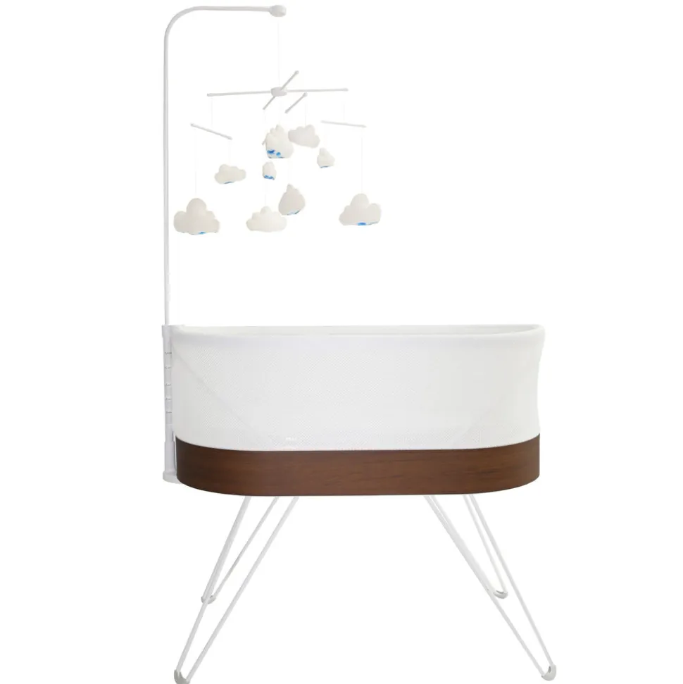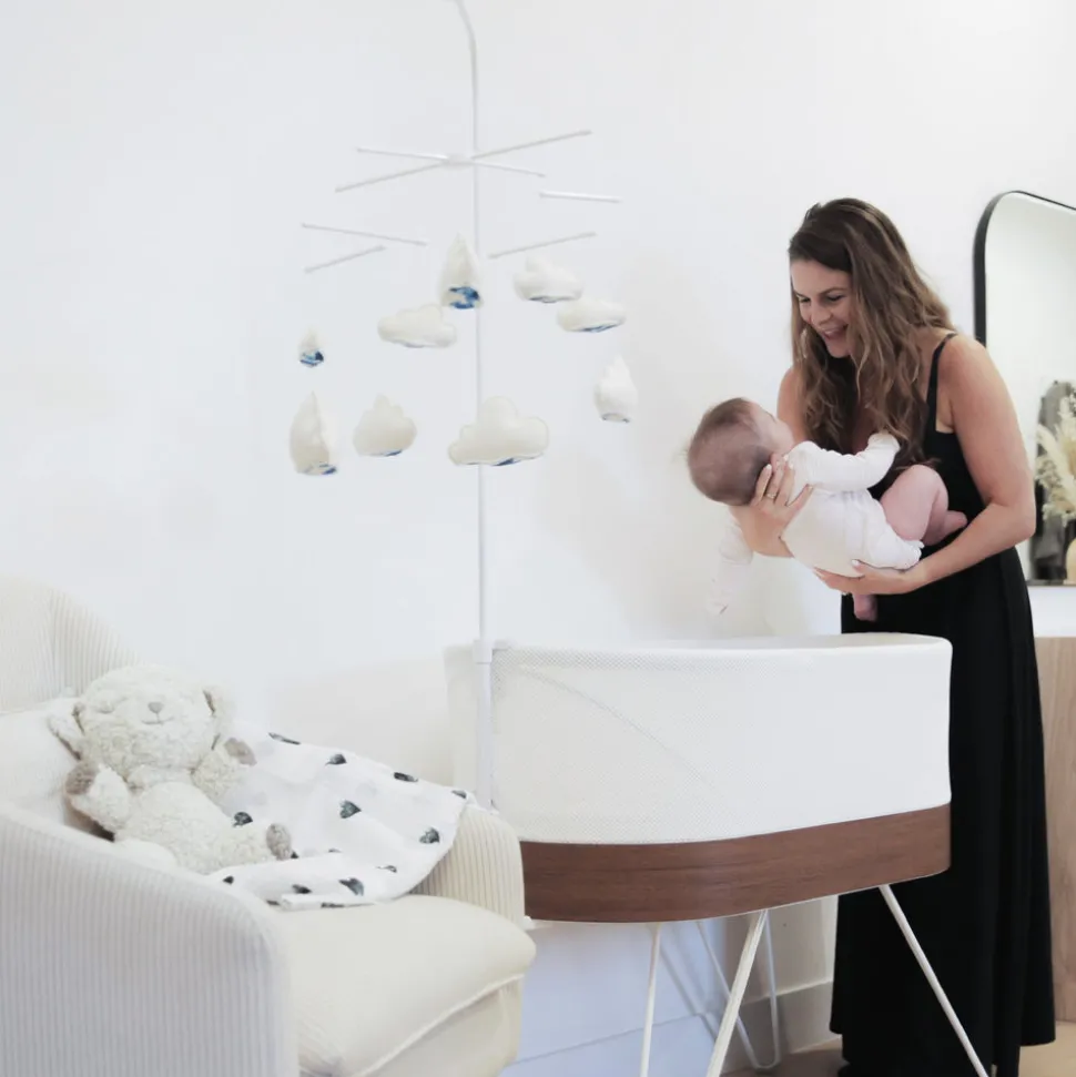 Nine clouds with wool exterior and mixed polyfill interior. Visually engaging pattern on the underside of each cloud. Easy assembly. Securely attaches to SNOO. Can be detached from mount to hang from the ceiling. Easily swings out of the way when you need to put baby in or lift baby out of SNOO.