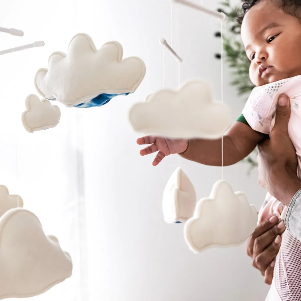 Pediatrician and child development specialist Dr. Harvey Karp and his wife and business partner, Nina Montée-Karp, founded Happiest Baby, Inc. in 2015 to develop science-based products, content, and services to enhance child well-being and solve everyday parenting challenges. Want your little one to sleep on cloud nine? They will snooze even more sweetly with the Sky Mobile and its playful clouds dancing above them. Teach your baby to reach for the stars. When awake, your baby will love watching the beautiful sky pattern printed on the underside of each woolen cloud.