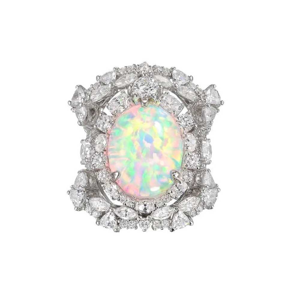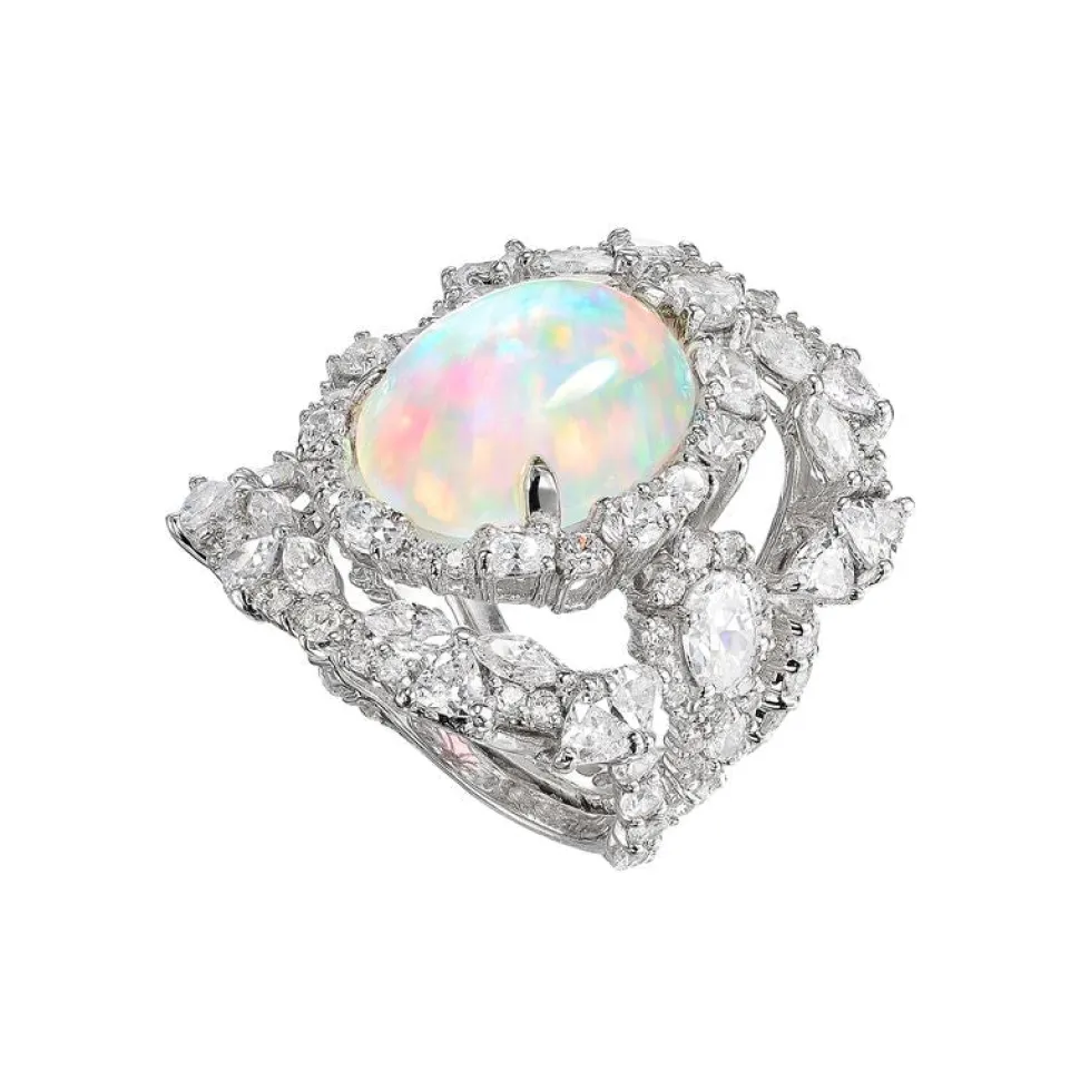 London-based Anabela Chan’s background in architecture and luxury fashion led to the first fine jewelry line to champion laboratory-grown gemstones. Today, its artisanal craftsmanship and sustainable innovations have found a place in the collections of royals, Rihanna, Taylor Swift, and sophisticated women worldwide. The Sky Opal Ocean Rings are a stunning set of 3 in 18K white gold and rhodium vermeil, intricately prong and pave-set with an array of laboratory-grown and created gemstones. Including a central 5.4 carat opal cabochon and 122 oval, marquise and round brilliant-cut simulated white diamonds of 14 carats in total weight.