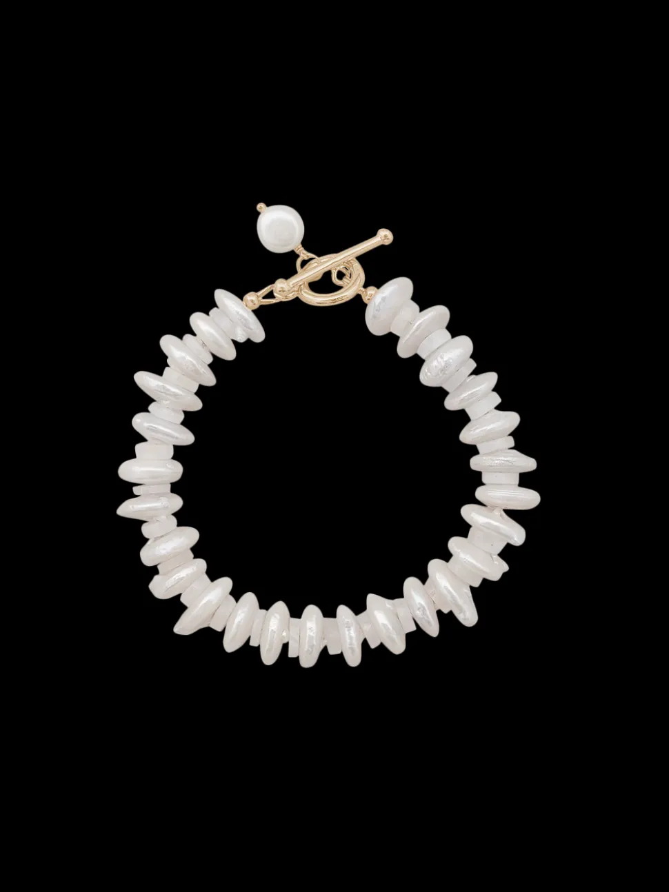 From Newport, Rhode Island, designer Kerry McGauley uses her experience in the fashion industry and inspiration from the town’s picturesque shoreline to craft singular yet timeless pieces—shining at the most memorable events and through your everyday. The Skye Bracelet in White features a harmonious blend of freshwater pearls and moonstone gemstones, secured with a gold-plated toggle closure. A luminous addition to any wrist stack.