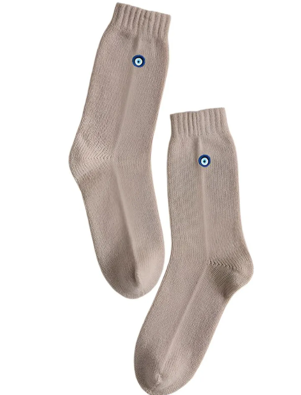 For nearly 100 years and three generations, Matouk has handcrafted luxury linens from the world’s finest materials. Their dedicated artisans in Fall River, Massachusetts are committed to creating the highest quality, most-loved bed, bath, and table linens for your home. Slip your feet into warm clouds of 100% cashmere and discover the epitome of coziness and comfort. Made in Scotland, the exquisitely soft Sleeping Socks Evil Eye in Beach are a one-size style available in an array of colors, from timeless neutrals to bold seasonal shades. Each features a unique “evil eye” detail near the top—traditionally used to ward off evil intentions—adding a playful, personalized touch. A stylish, thoughtful gift for yourself or someone you love.