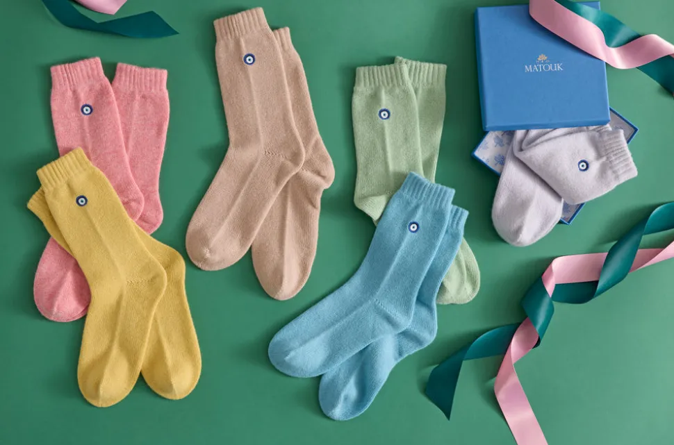 For nearly 100 years and three generations, Matouk has handcrafted luxury linens from the world’s finest materials. Their dedicated artisans in Fall River, Massachusetts are committed to creating the highest quality, most-loved bed, bath, and table linens for your home. Slip your feet into warm clouds of 100% cashmere and discover the epitome of coziness and comfort. Made in Scotland, the exquisitely soft Sleeping Socks Evil Eye in Willow are a one-size style available in an array of colors, from timeless neutrals to bold seasonal shades. Each features a unique “evil eye” detail near the top—traditionally used to ward off evil intentions—adding a playful, personalized touch. A stylish, thoughtful gift for yourself or someone you love.
