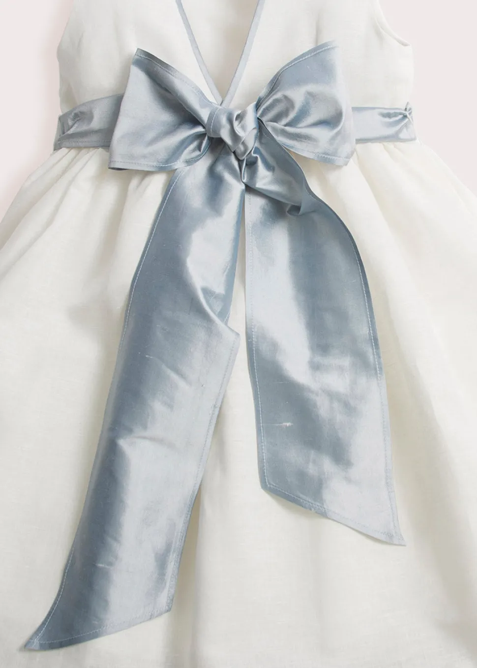 Renowned for exceptional craftsmanship and timeless design, Pepa London creates traditional childrenswear to be treasured and passed down. Each piece reflects the brand’s belief in dressing children like children, combining British style with refined details, comfort, and enduring elegance. The Sleeveless Flower Girl Dress in Ivory with Blue Silk Sash is a charming open-back silhouette crafted in soft linen-cotton with a rounded collar and delicate blue silk trims. Finished with a voluminous skirt and a bow-tied sash, this refined piece is a beautiful choice for flower girls and special celebrations.