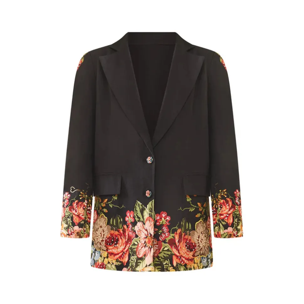 100% Cotton Canvas. Shoulder pads. Two button closure in the front. Two outside pockets. Adorned with floral print & hand embroidery detailing. Satin lining. Boyfriend fit. Made in India.