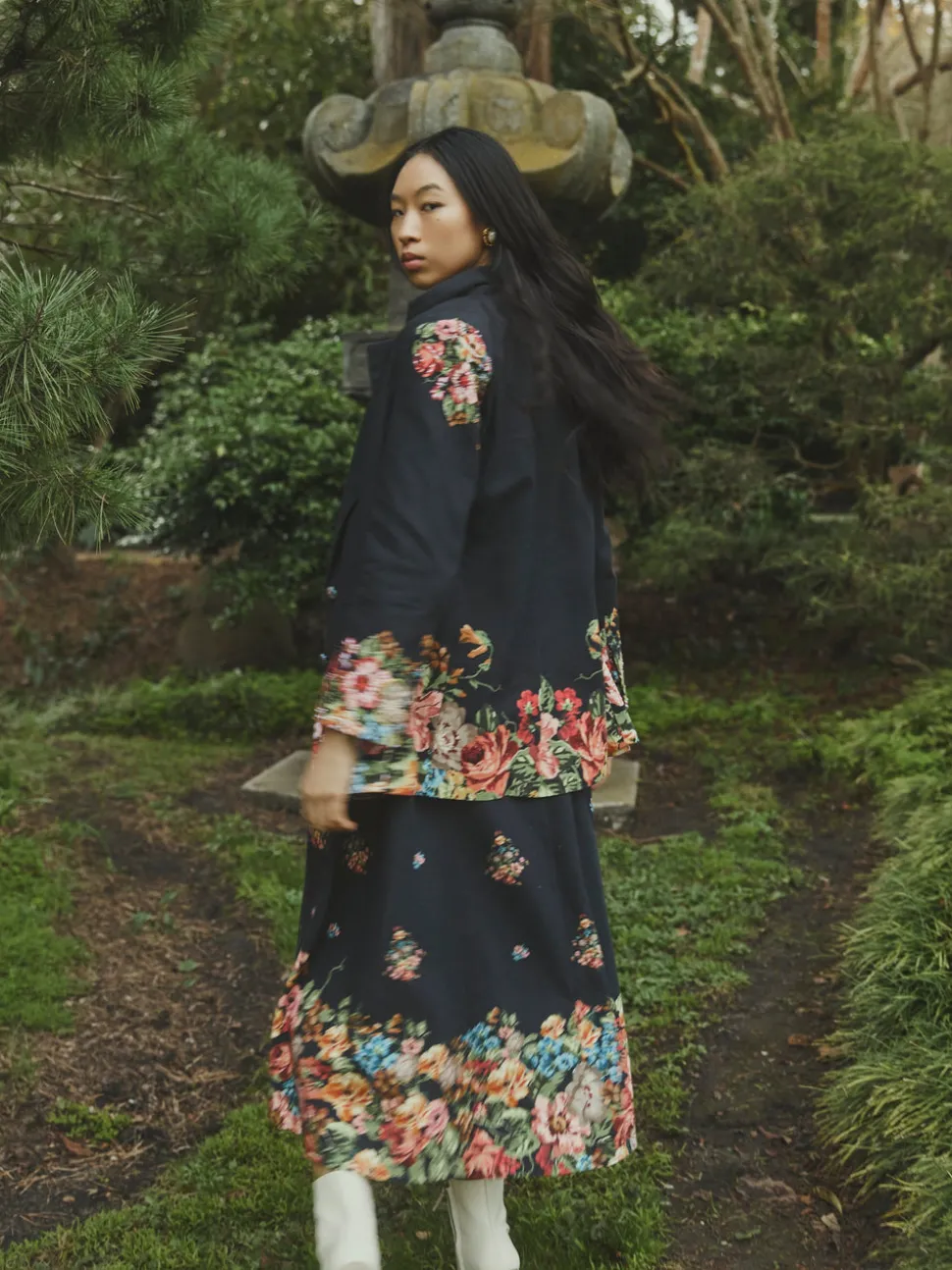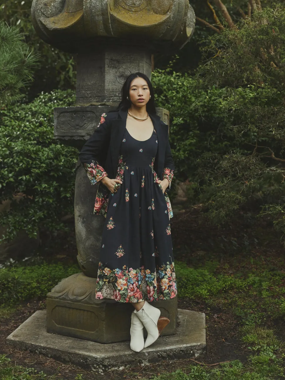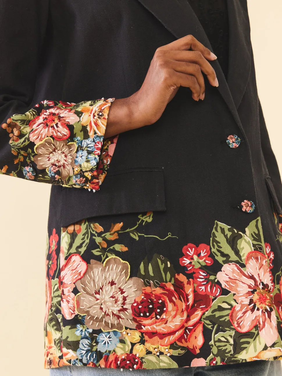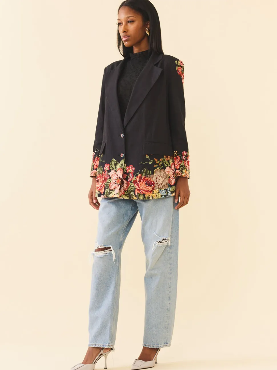 Tomboy looks, girly-girl styles, and an always fashionable approach define Eddy’s aesthetic. With a focus on bold and feminine silhouettes, Eddy dresses and tops pair elevated California bohemian with global inspiration; these are clothes designed to make you feel good inside and out. The Sloan Blazer in Carmel Victorian Floral has a boxy boyfriend fit featuring shoulder pads. Hand-embroidered florals add feminine elegance.