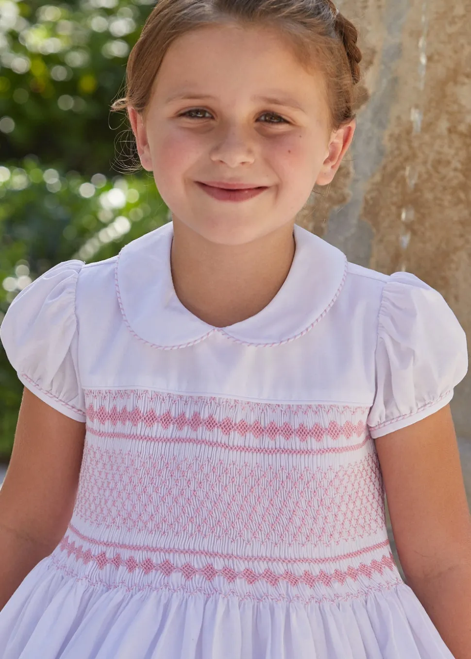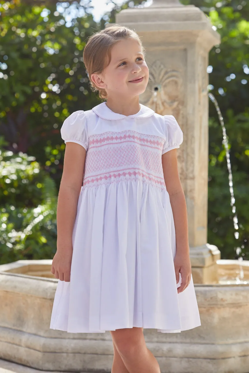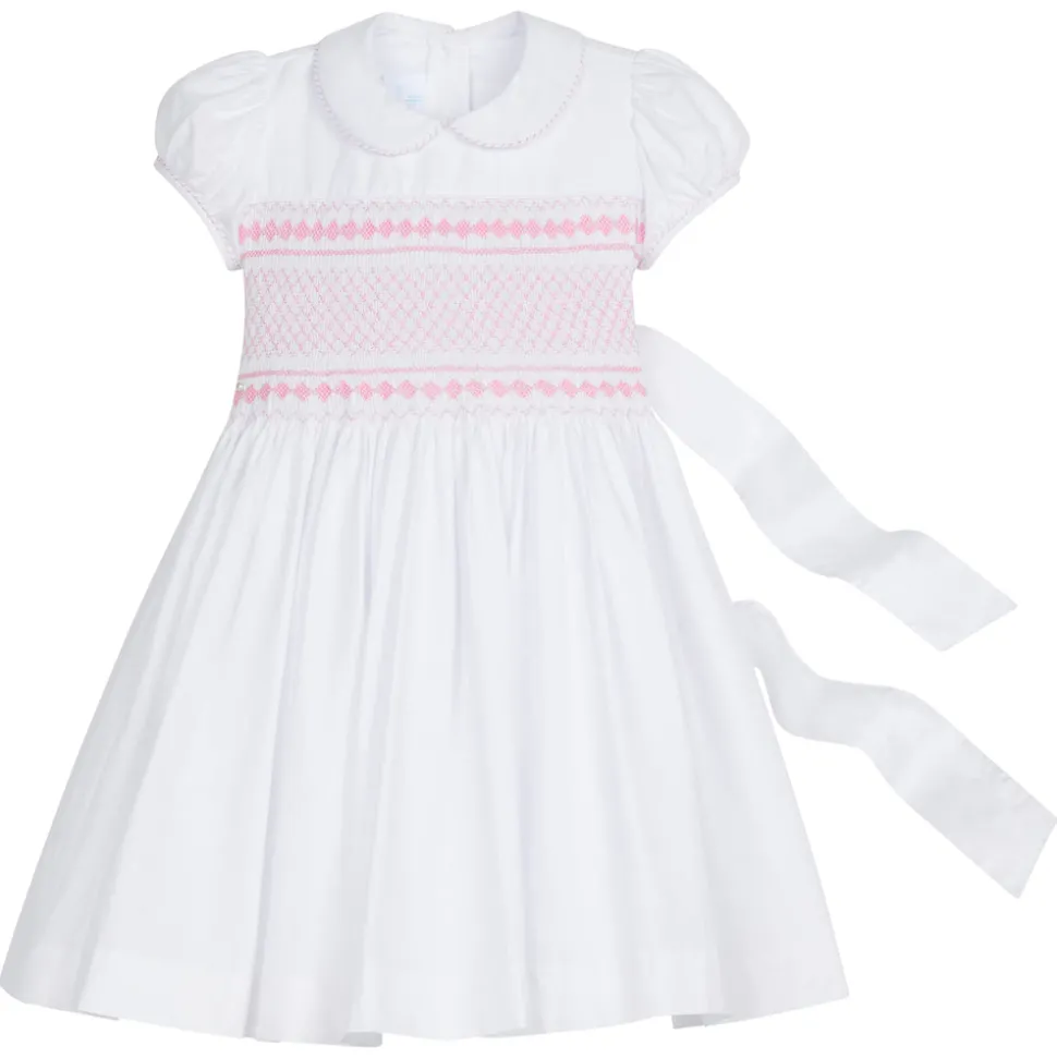 Shannon Latham founded Little English in 2004 with the belief that children should always be well-dressed. Employing hand-smocking, hand-embroidery, and the very best fabrics, Shannon and her daughter design timeless pieces that will be worn for generations to come. The Smocked Emery Dress in Light Pink offers simple elegance with a Peter Pan collar, cap sleeves, and delicate light pink chest smocking. The full skirt encourages graceful movement, while the tie sash at the back ensures a refined fit, making this dress an exquisite choice for special occasions.