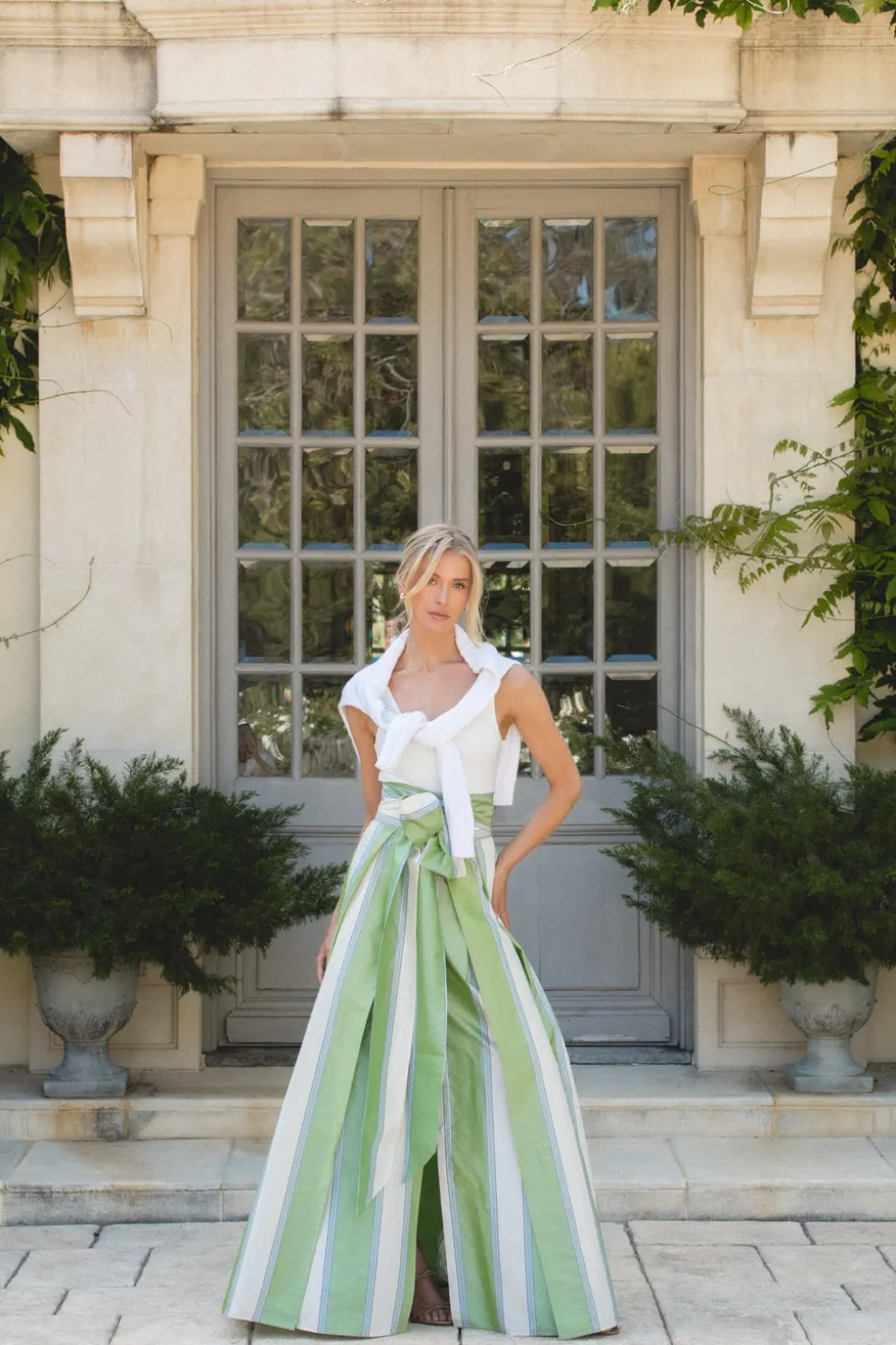 Designed in a California atelier, Luciana Emilia brings a sense of modern grandeur to elegant occasions. Born from the founder’s own wedding, where she designed bespoke gowns for her mother and bridesmaids, each piece captures a sculptural balance of dramatic silhouettes, exquisite fabrics, and artful femininity. The Socialite Skirt in Green Stripe is a statement in tailored sophistication, crafted from crisp silk taffeta in a classic floor-length silhouette. Featuring a high waist, sweeping train, and self-tie bow belt, it evokes old-world glamour with a playful modern twist.