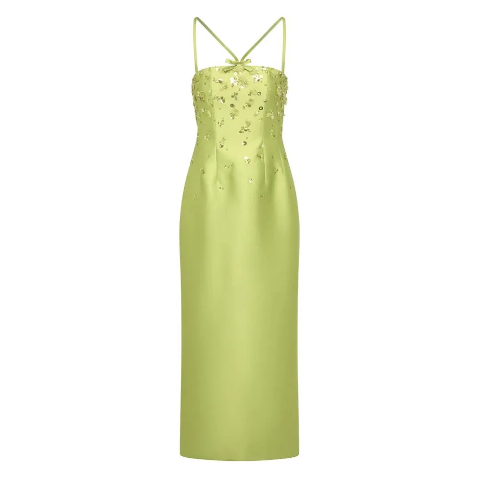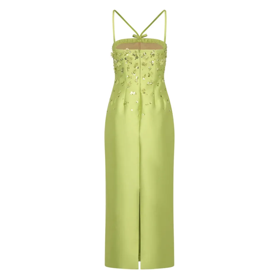 A graduate of the Savannah College of Design, award-winning Alexandra Pijut’s namesake line arrives from her studio in New York, offering luxe ready-to-wear pieces that distinguish themselves between femininity and practicality. The brand’s spring collection, “Picnic in Jaipur,” is inspired by the vibrant, maximalist colors and patterns of Villa Palladio. Offering a clean silhouette, with whimsical beading on the bodice, the Sofia Dress in Lime Silk Wool with Sporadic Sequins is defined by its column silhouette, and then adorned with silver paillettes, fabric fans, and crystals. At once playful and elegant, with a touch of romance.