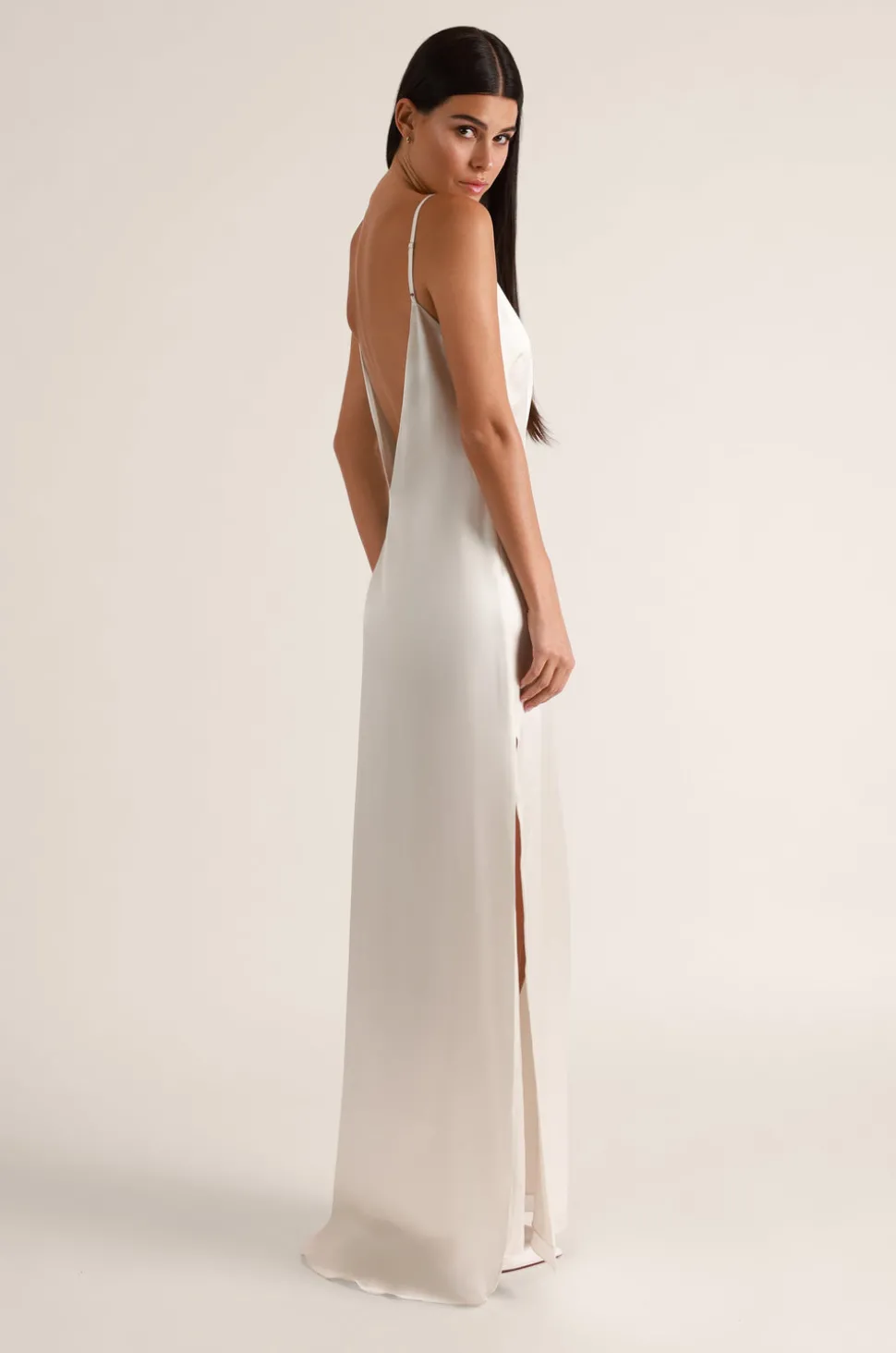 100% silk. Silk charmeuse. Adjustable straps. Low V-back. Side slit detail.