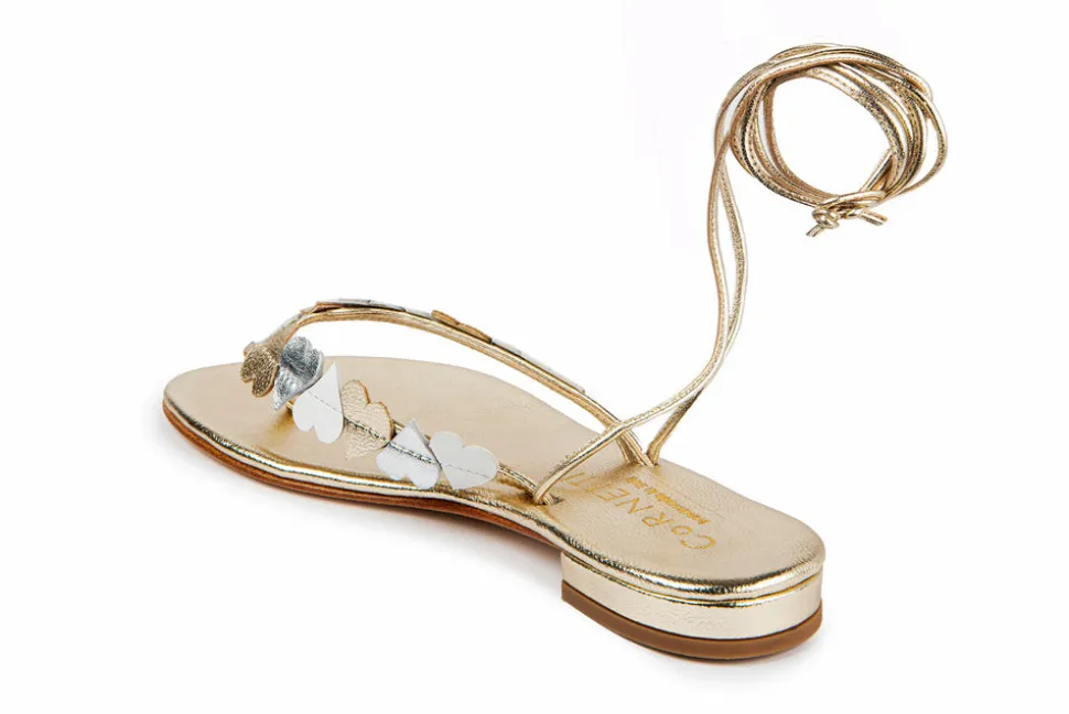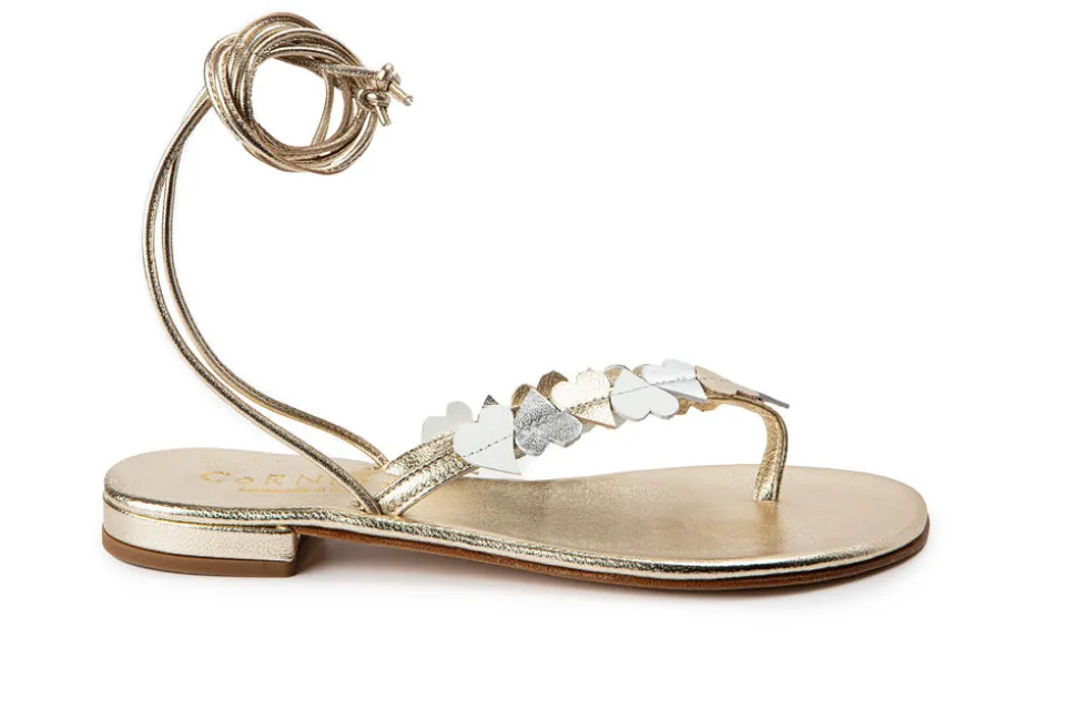 California-born designer Claudia Lucia Aragon dreamt up Cornetti while living and studying along the Amalfi Coast. Each sandal is meticulously crafted to last for long, well-loved summers—made from the highest quality and mindfully sourced leathers. Cornetti, which translates to “little bull horns,” is a symbol of luck that has been defined by Italian culture since ancient times. The Solaro in Gold & Hearts Multi is a thong-style sandal detailed with delicate heart accents and long laces for an artful, feminine finish.
