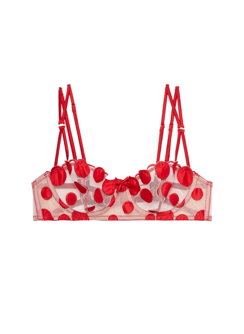 Inspired by Charles Baudelaire’s masterful collection of poetry entitled “Les Fleurs du Mal,” Jennifer Zuccarini founded Fleur du Mal with the belief that wearing beautiful lingerie should be an everyday affair. Tastefully provocative, the luxury brand has amassed a cult following of devotees who adore the sultry and empowering pieces. The flirty Some Like it Dot Balconette Bra features luxe satin polka dot embroidery on sheer tulle ground. Adjustable double silk straps with keyring detail amps up the sex appeal. Complete the set with the matching Some like it Dot Thong and Garter.