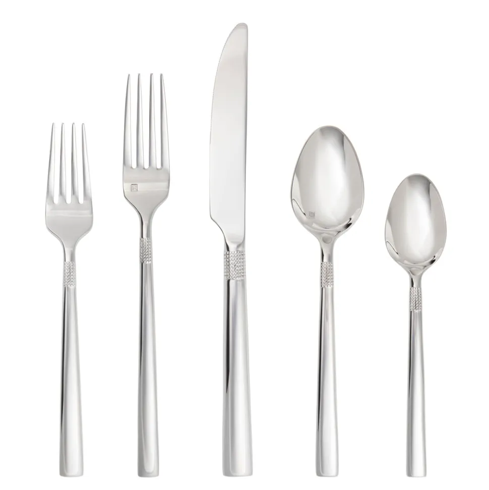 Set of 5 or 20 pieces. Stainless steel. 1 or 4 of each: dinner fork, soup spoon, dessert spoon, dinner knife and salad fork.