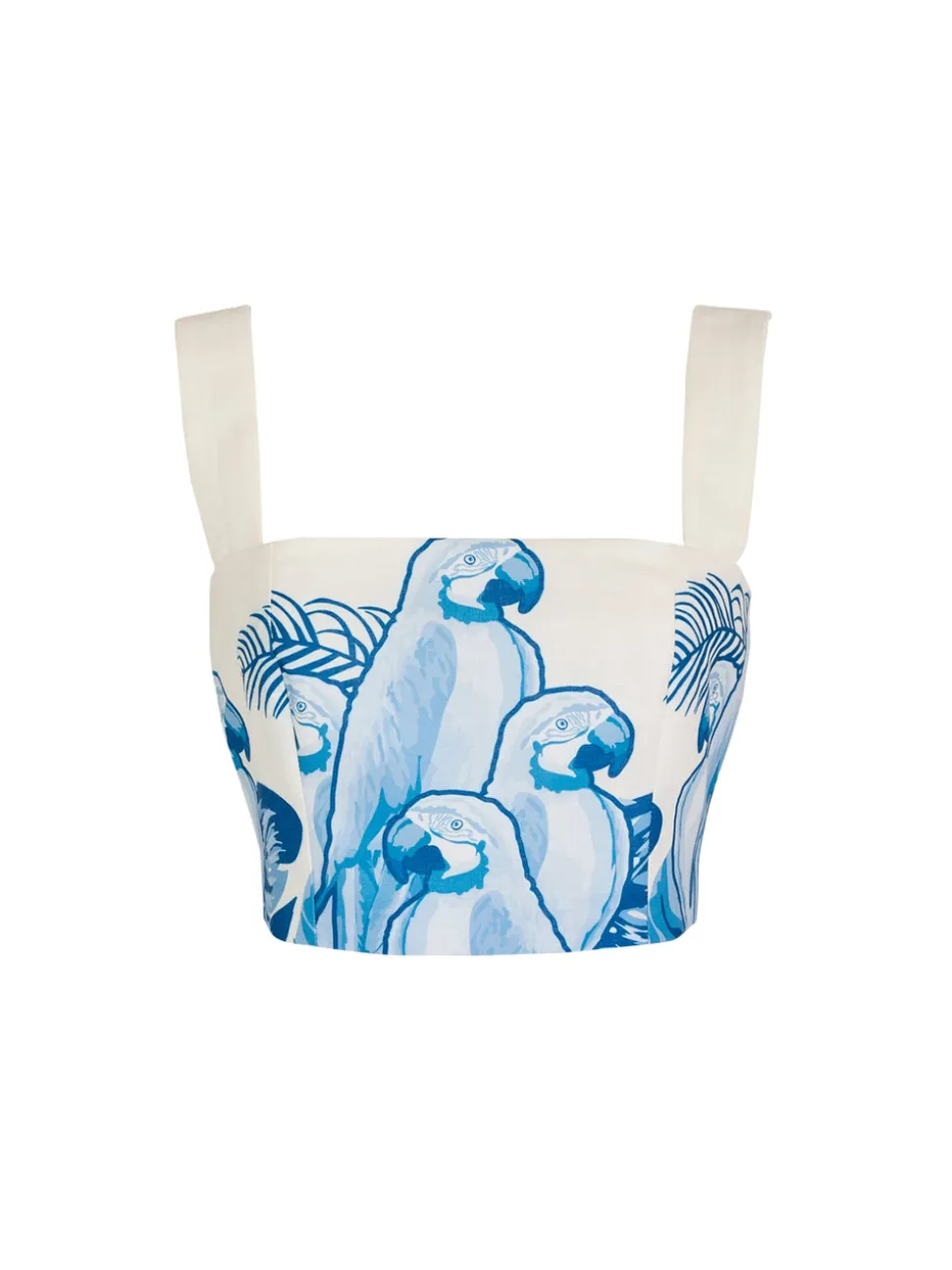 Founded by Daniela Panaro, No Pise La Grama, which translates to “don’t step on the grass,” is a Venezuelan fashion brand known for its feminine, timeless designs. As the name suggests, there’s a strong connection to nature through the elevated yet laid-back aesthetic inspired by travel and the art of traditional craftsmanship. The Sotavento Top in Blue Macaw Print channels tropical vibrancy with its vivid avian motif and crisp linen texture. Lightweight and expressive, it’s a standout style for warm-weather days—ideal for pairing with relaxed tailoring or high-waisted skirts.
