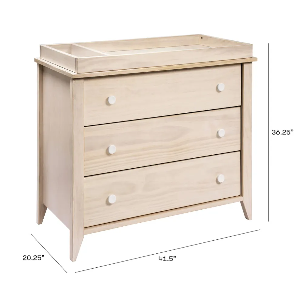 Washed natural and white finish. Made with FSC®-certified sustainable New Zealand pine wood and TSCA-compliant engineered wood. GREENGUARD Gold Certified. Finished in a non-toxic multi-step painting and staining process that is lead and phthalate safe. Includes a removable changing tray with two compartments. Three spacious drawers with pre-installed smooth metal glides and safety stops. Anti-tip kit included for added safety. Pairs with the Sprout 4-in-1 Convertible Crib.