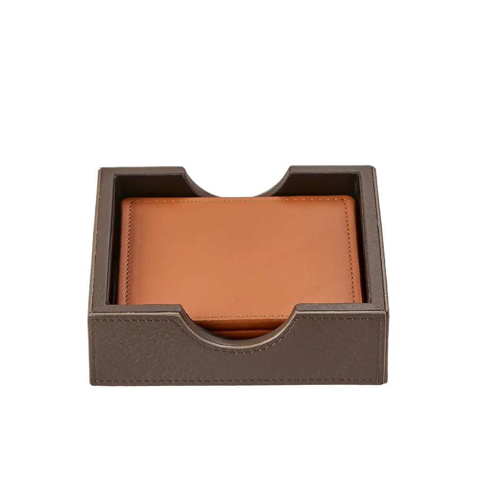 Traditional leather. Set of four square coasters in a matching leather tray. Water-treated with non-skid bottoms. Personalization available.