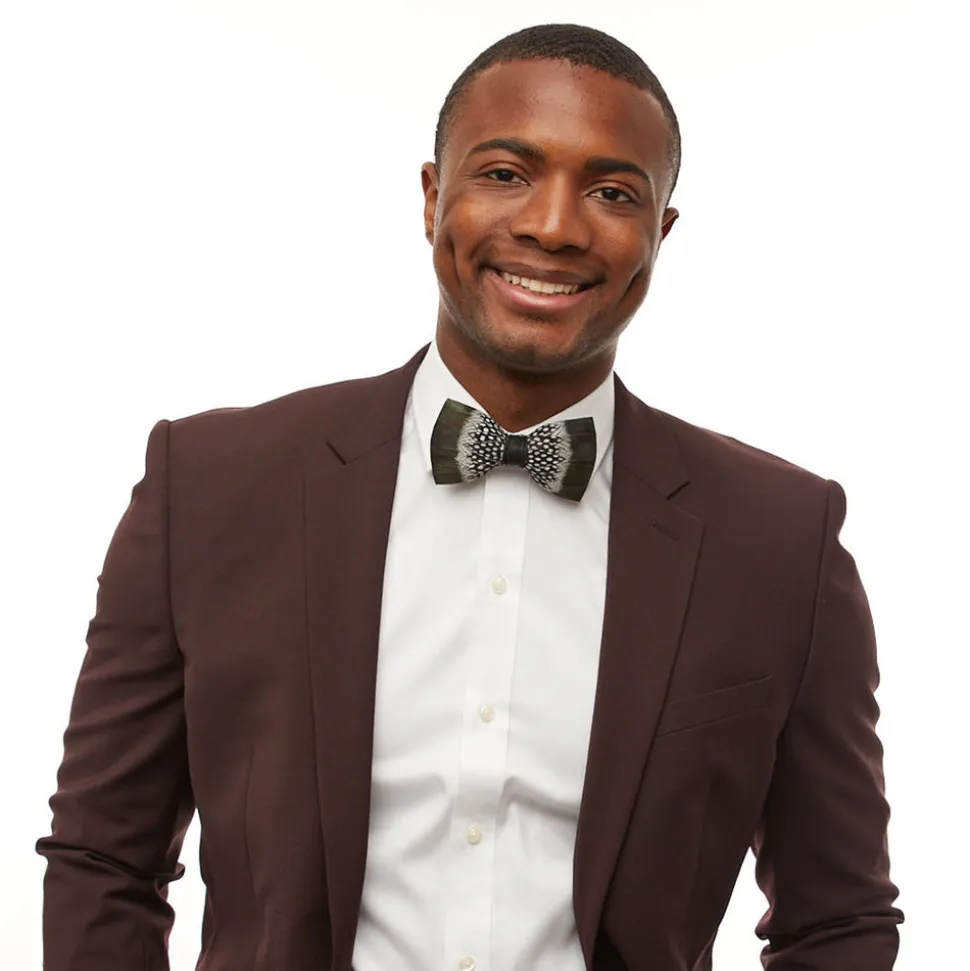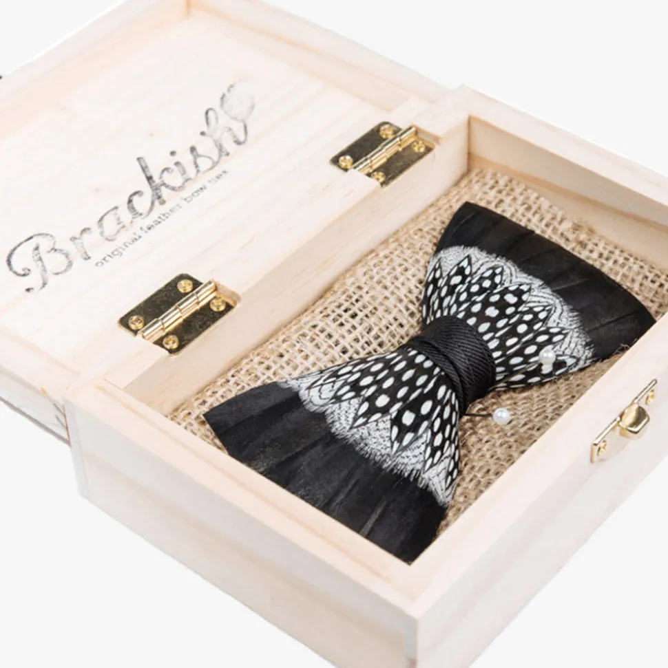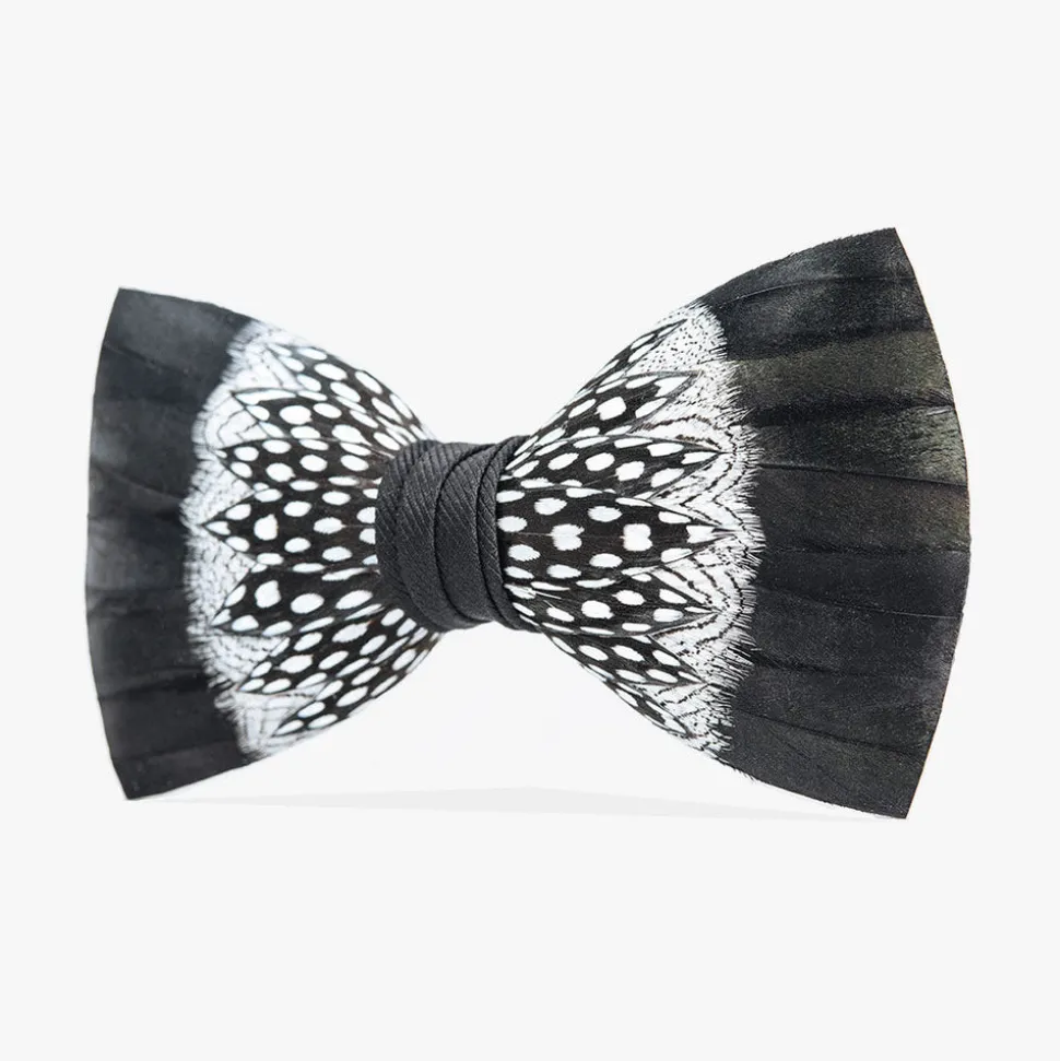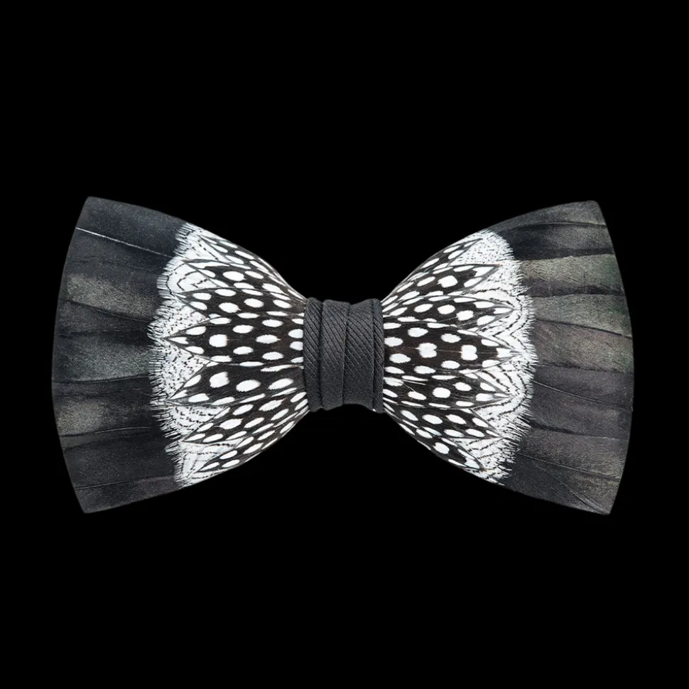Brackish began with one feather bow tie designed by Ben Ross and gifted to his groomsman, Jeff Plotner. Since its inception, the brand has blossomed into a full line of men’s and women’s accessories designed and handcrafted in Charleston, South Carolina with each piece focused on honoring the beauty found in nature. The St. Pierre Bow Tie is inspired by the St. Pierre Creek, a place that holds memories of to drive an outboard motor for the first time, a coming of age moment in the most serene of settings. This piece features black and white with a slight amount of iridescence on the outer edges. Made with guinea, pheasant, and rooster feathers.