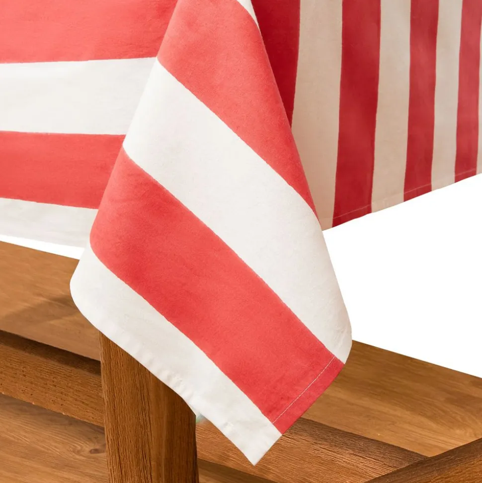 Idyllic landscapes, sumptuous colors, and the vibrant beauty of Southern France describes Couleur Nature. This brand of hand-painted table linens aims to bring a Provençal sense of effortlessness, rich culture, and joie de vivre to your life and home—no matter where you live. Transform your dining experience with the St. Tropez Tablecloth in Red. Handcrafted with care, this piece features timeless wide cabana stripes, effortlessly bringing a touch of French sophistication to any meal. Made from a durable blend of heavyweight linen and cotton, it combines both luxury and practicality. Whether it’s for a cozy family dinner or a lively 4th of July celebration, this tablecloth is designed for easy care without compromising on style.