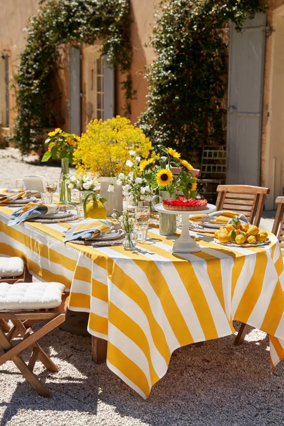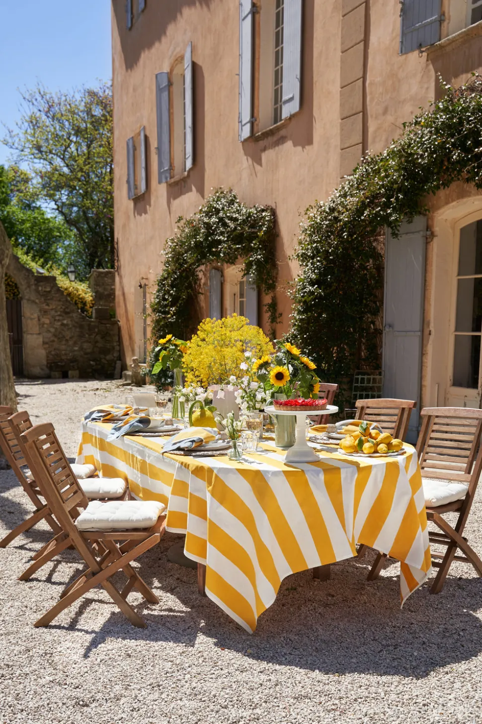 Idyllic landscapes, sumptuous colors, and the vibrant beauty of Southern France describes Couleur Nature. This brand of hand-painted table linens aims to bring a Provençal sense of effortlessness, rich culture, and joie de vivre to your life and home—no matter where you live. Transform your dining experience with the St. Tropez Tablecloth in Yellow. Handcrafted with care, this piece features timeless wide cabana stripes, effortlessly bringing a touch of French sophistication to any meal. Made from a durable blend of heavyweight linen and cotton, it combines both luxury and practicality. Whether it’s for a cozy family dinner or a lively 4th of July celebration, this tablecloth is designed for easy care without compromising on style.