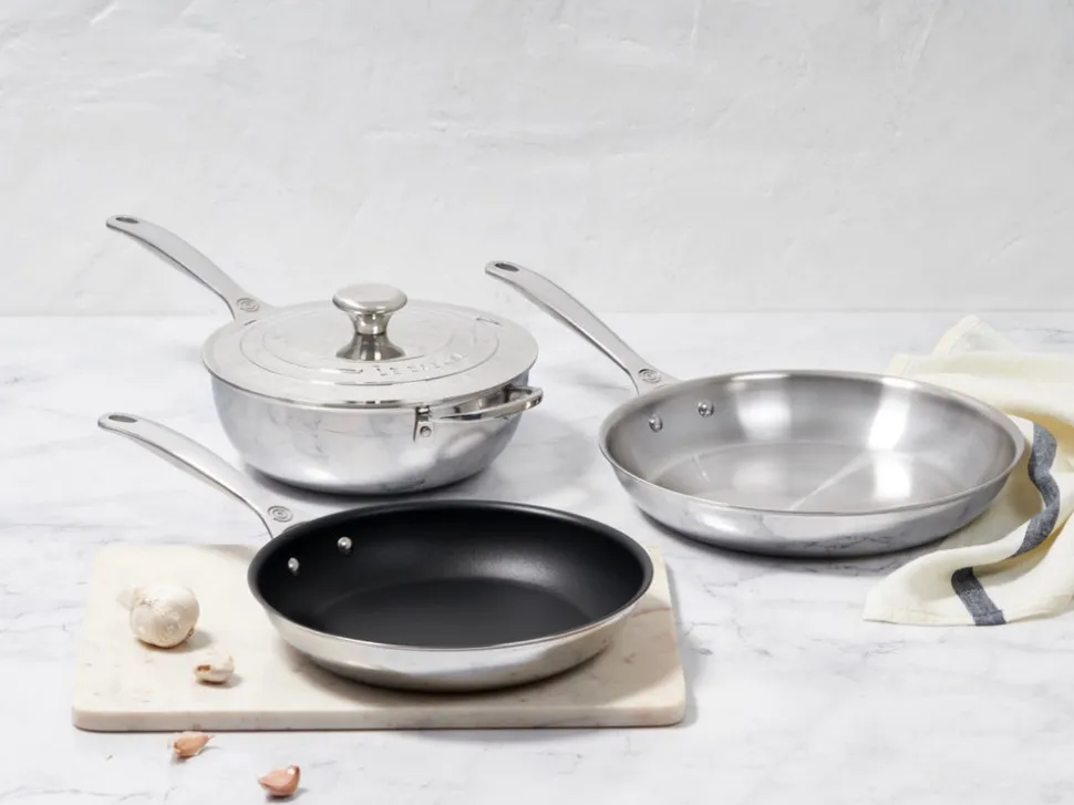 Tri-Ply Stainless Steel. Compatible with all cooktops and oven-safe up to 500°F. Made in China.