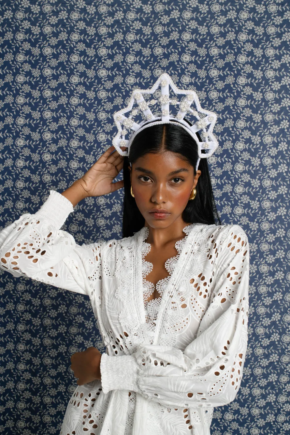 Magnetic Midnight is an evening and special occasion accessories brand by designer Lucia Echavarría. Echavarria’s distinct headbands, bags, and accessories are unique statement pieces that reflect a modern aesthetic imbued with a love for tradition and craftsmanship. Each piece is beautifully handcrafted in Colombia, requiring a long fabrication process from a variety of craftsmen around the country. Only a limited number are made and each piece is unique. The Star Shaped Pearl Headpiece in White Velvet features a pointed frame and white velvet base embellished with elaborate designs in faux pearls. A statement piece for your most special day.