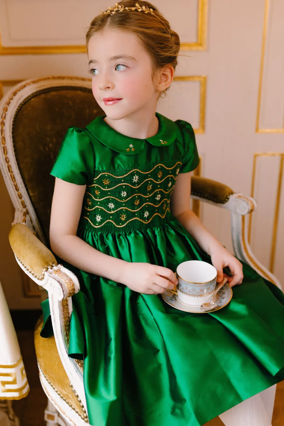 Double layer 100% cotton. 30% silk, 70% acrylic. Traditional green french silk handmade smocked dress (variant available in red velvet). Short balloon sleeves. Majestic gold floral garland embroidery on the chest and on the Peter Pan collar. Reversible green back bow and covered buttons. Bloomer from 6M-24M.
