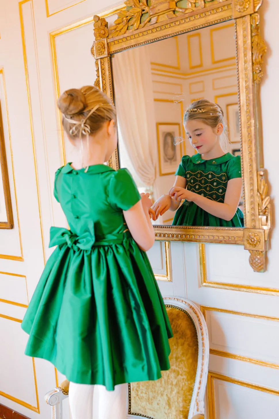Antoinette Paris creates elegant, handmade garments for little girls, designed in Paris with sophisticated, refined, and exclusive “Haute Couture” details. Their collections include dresses, dungarees, and bubbles, available from birth to 10 years old, made for any occasion and tailored for a new generation of children. A true heirloom, the Stella Green Silk Short Sleeve Smocked Dress is deal for ceremonies, flower girls, Christenings, 1st communions, and special occasion.