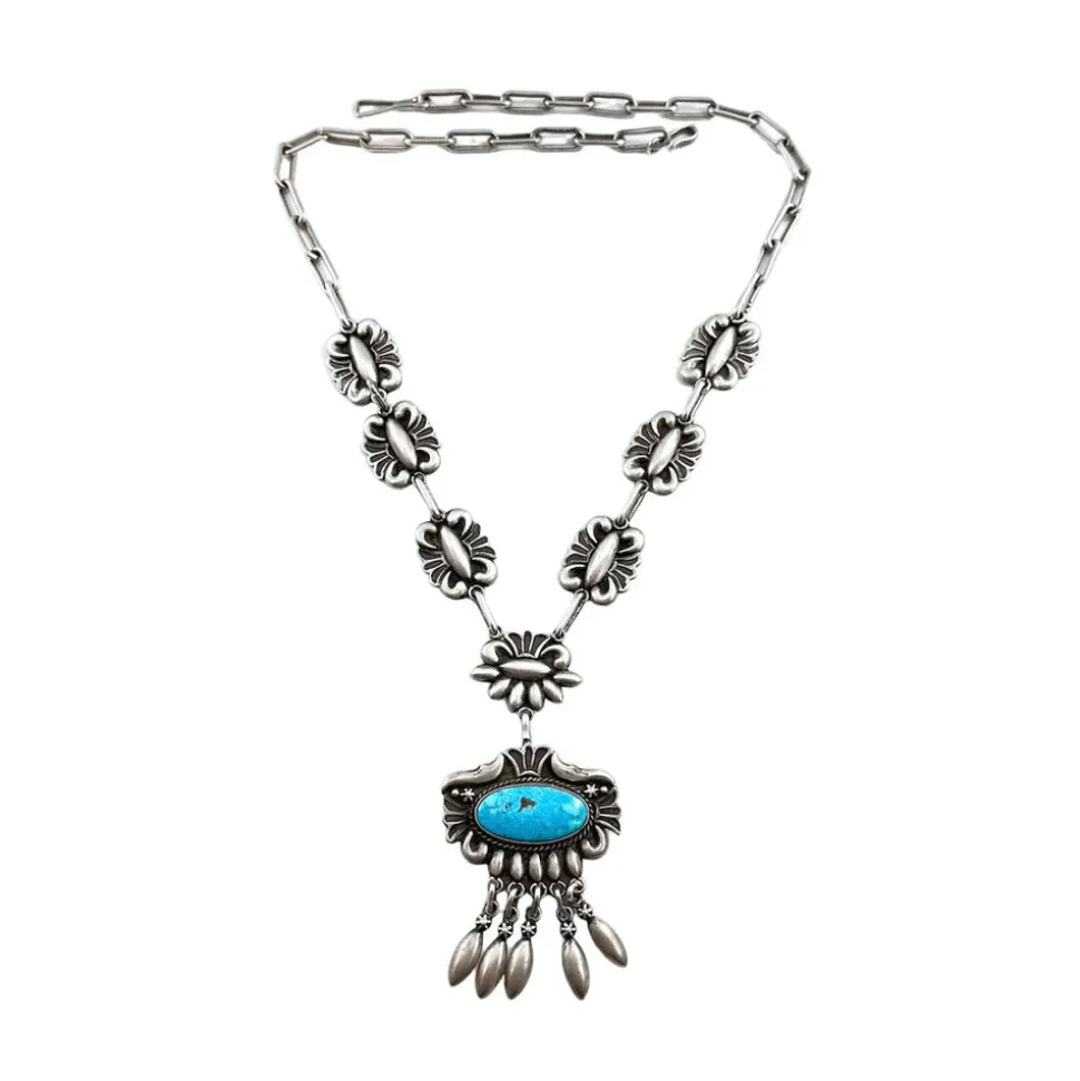 Through ethical sourcing and philanthropic giving, Vicki Turbeville’s collections showcase the finest handcrafted Native American jewelry. With longstanding relationships with artists and dealers across Native American communities, the brand remains steadfast in its support of First Nations peoples. Dedicated to transparency, Vicki Turbeville ensures best practices in provenance, identification, and authentication of all jewelry pieces. Completely made by hand, this sterling silver necklace features natural Kingman turquoise stone and was crafted by Navajo artist Thomas Jim. One of a kind, the beauty truly lies in the details, like the dangles below the pendant and the handmade link chain and clasp.