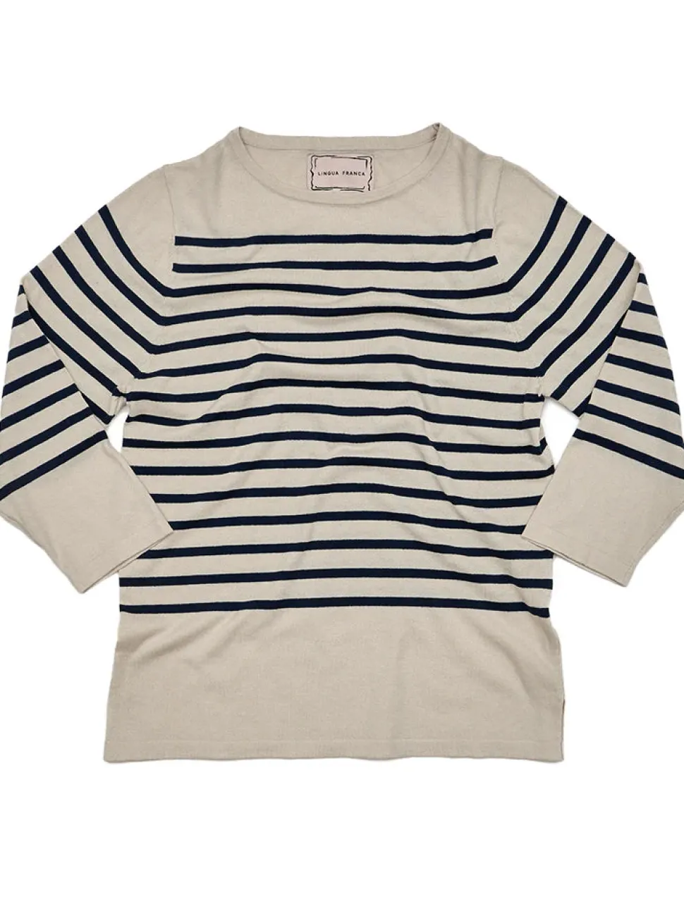 Lingua Franca is a line of sustainably-sourced, fair trade luxury ready-to-wear and cashmere pieces, all hand-stitched by women in New York City. Every word on Lingua Franca’s staple pullover sweaters is chalked in script by designer Rachelle Hruska MacPherson before it is ever stitched. Extremely lightweight and fine gauge, the Striped Boatneck in Canvas is crafted from a luxurious silk and cotton blend for ultimate comfort. Inspired by traditional sailing sweaters, it’s a go-to for both casual wear and seaside adventures.