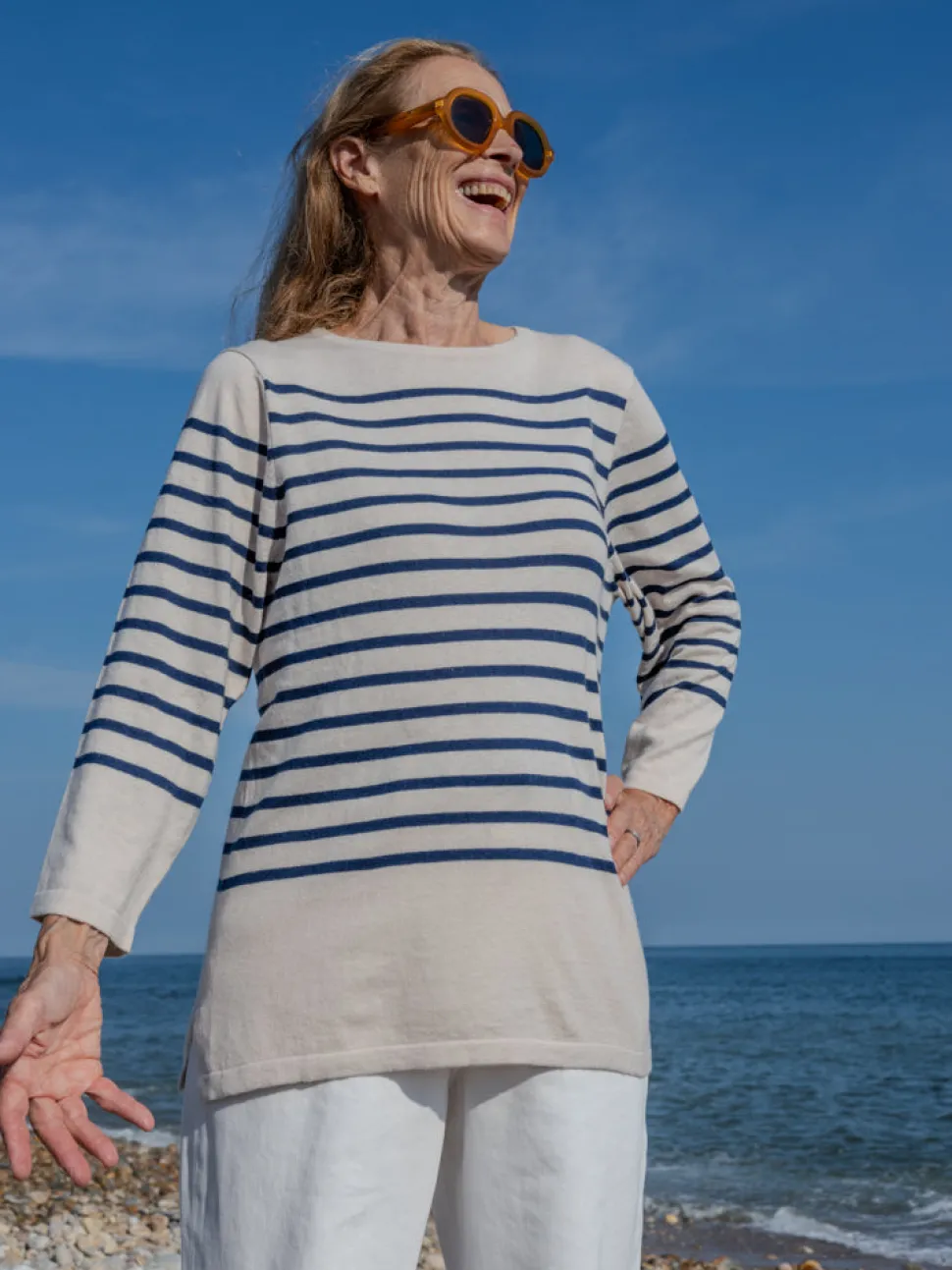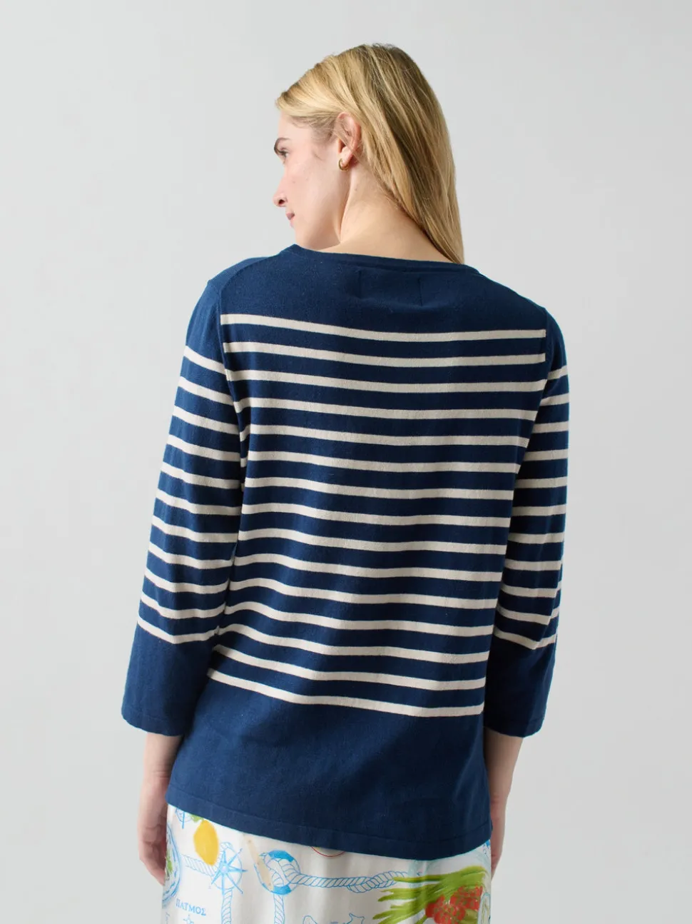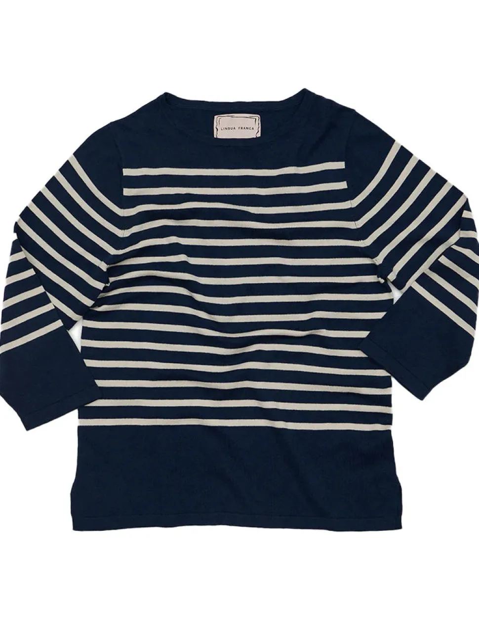 Lingua Franca is a line of sustainably-sourced, fair trade luxury ready-to-wear and cashmere pieces, all hand-stitched by women in New York City. Every word on Lingua Franca’s staple pullover sweaters is chalked in script by designer Rachelle Hruska MacPherson before it is ever stitched. Extremely lightweight and fine gauge, the Striped Boatneck in Navy is crafted from a luxurious silk and cotton blend for ultimate comfort. Inspired by traditional sailing sweaters, it’s a go-to for both casual wear and seaside adventures.