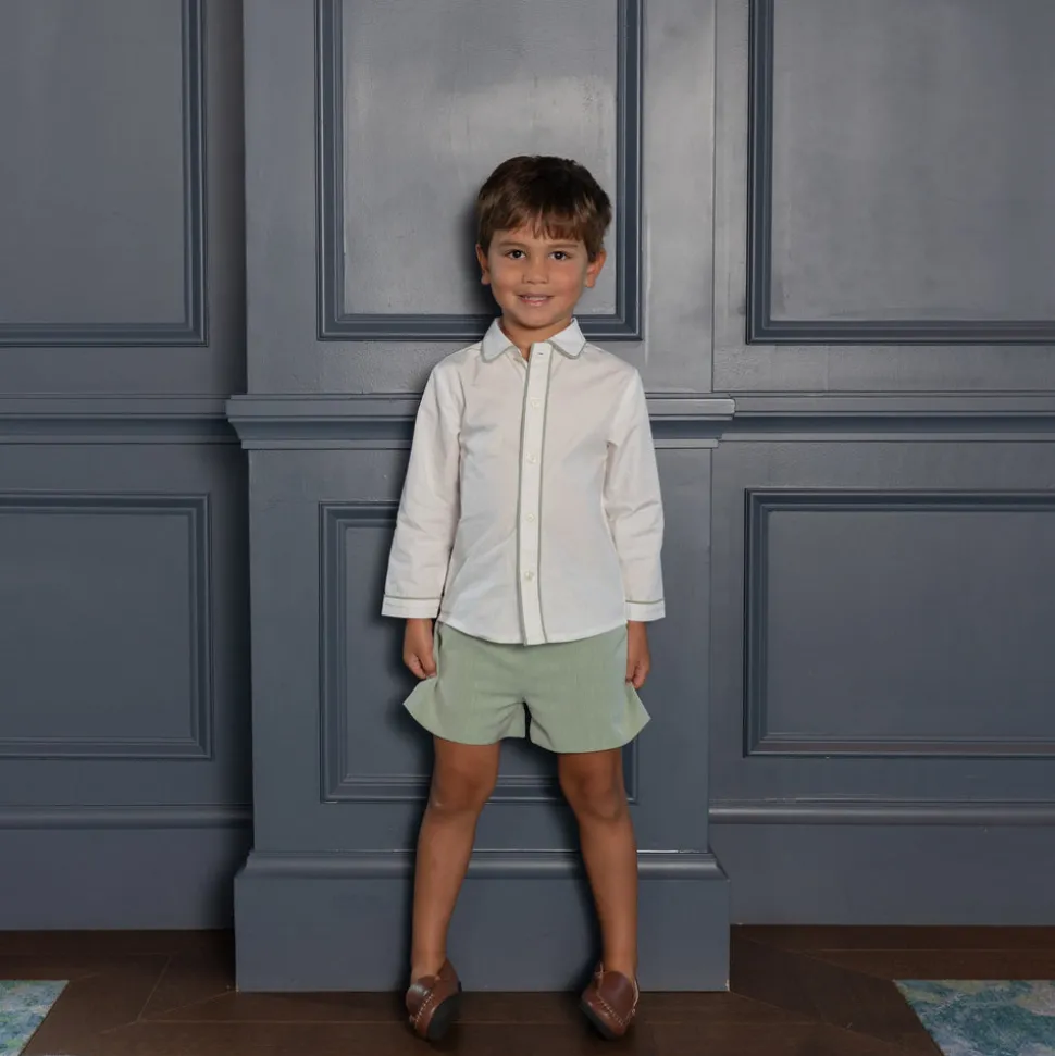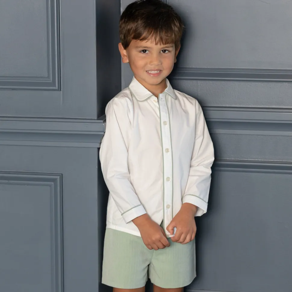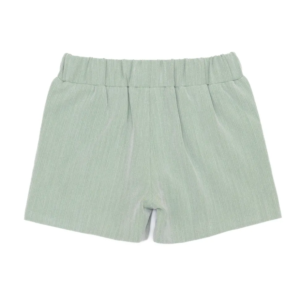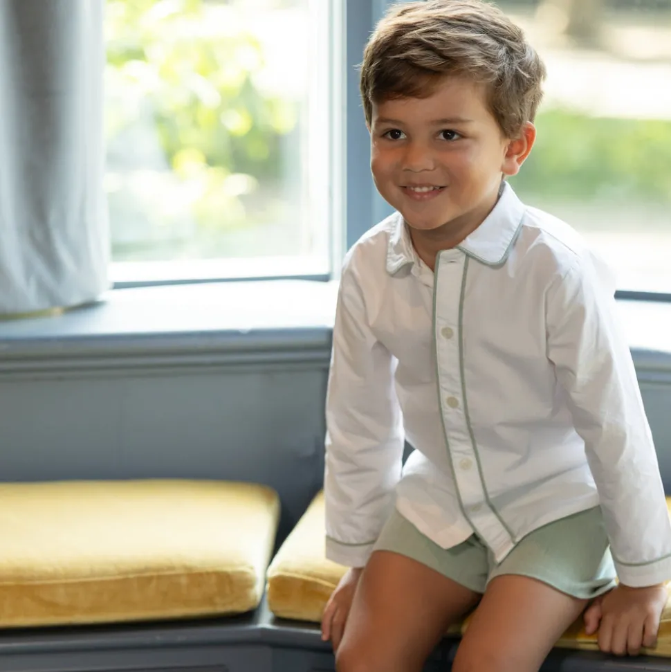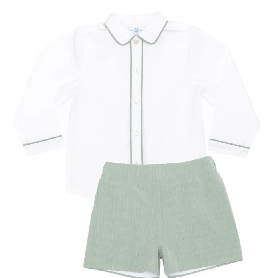 Hanover Herringbone fabric. Brendan Button Down with rounded collar. Elastic back shorts for ease of wear. Sage green hue inspired by English suiting.