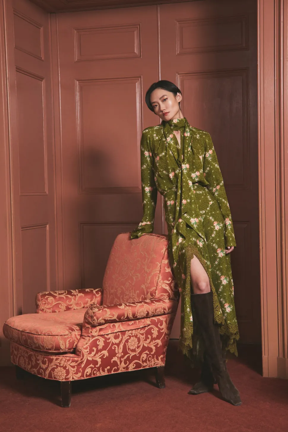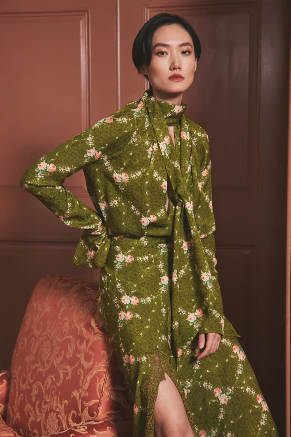 Founded by three New York City-based mothers who met through their kids, Cara Cara’s hallmarks include crisp poplin, house-designed prints, and casual glamour. The inspiration for their ethical womenswear comes from interior design, as well as the world’s most exotic locales. The Sundance Top in Trellis Olive is a fluid, feminine blouse with a distinctive silhouette. Designed with a mock neck and long ties, it features a deep-V cutout at the neckline, fluted cuffs, and an elliptical high-low hem. Gold-rimmed shank buttons add a refined touch, while the allover print lends visual intrigue.