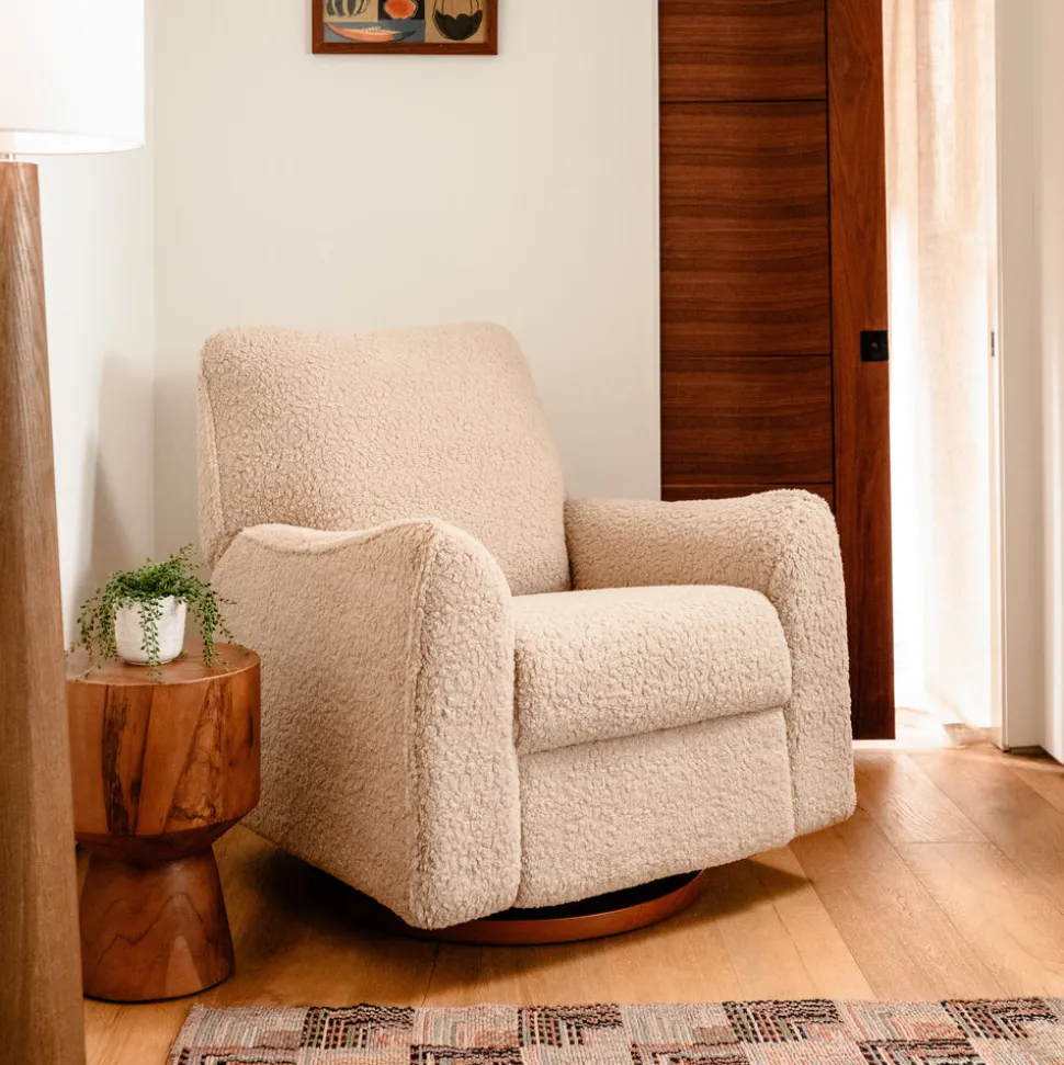 Blending avant-garde design with functional artistry, Nursery Works creates bold, sculptural pieces that elevate the modern nursery. Based in Los Angeles, the brand collaborates with visionary designers and artisans to push the boundaries to reimagining newborn essentials. Designed in collaboration with Babyletto, the Sunday Power Recliner and Swivel Glider in Chai Shearling balances cozy texture with clean, sculptural lines, offering a contemporary retreat for parent and child alike.