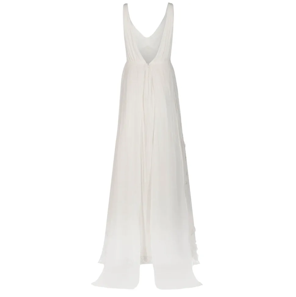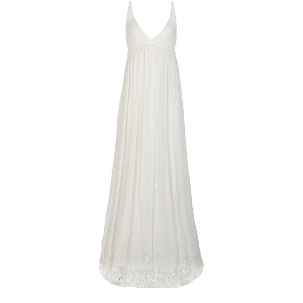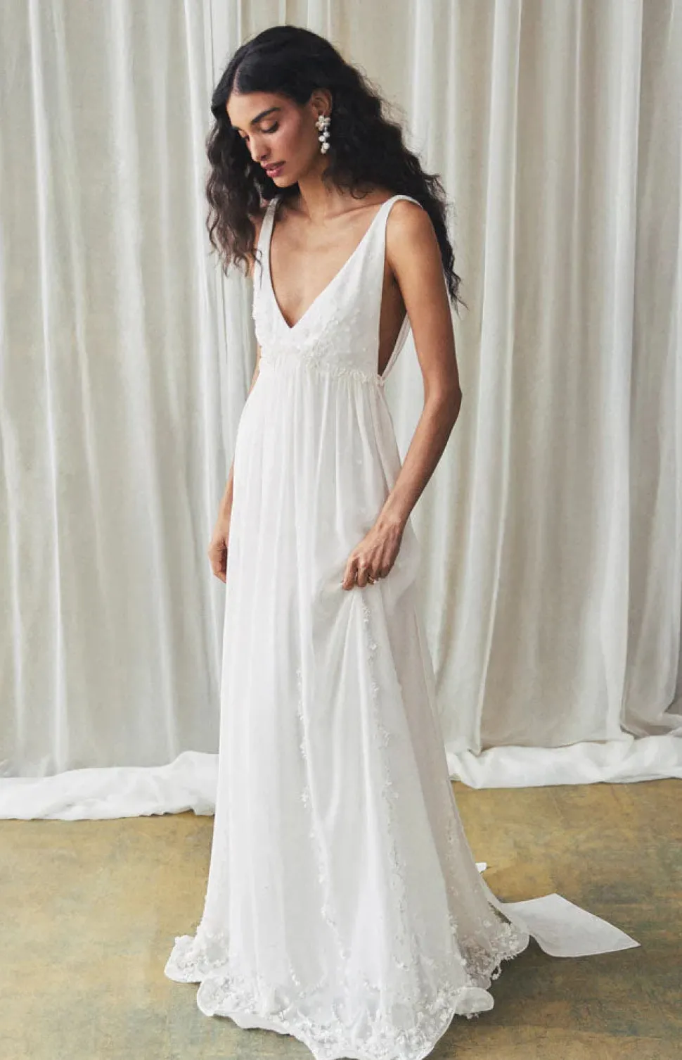 A graduate of the Savannah College of Design, award-winning Alexandra Pijut’s namesake line arrives from her studio in New York, offering luxe ready-to-wear pieces that distinguish themselves between femininity and practicality. Crafted from flowing ivory georgette, the Sunny Gown in Ivory Georgette with Scallop Floral Embellishment features a plunging neckline and delicate embellishments along the bodice and hem. A dramatic double train completes the look, creating graceful movement with every step. Features an invisible zipper for a seamless finish.