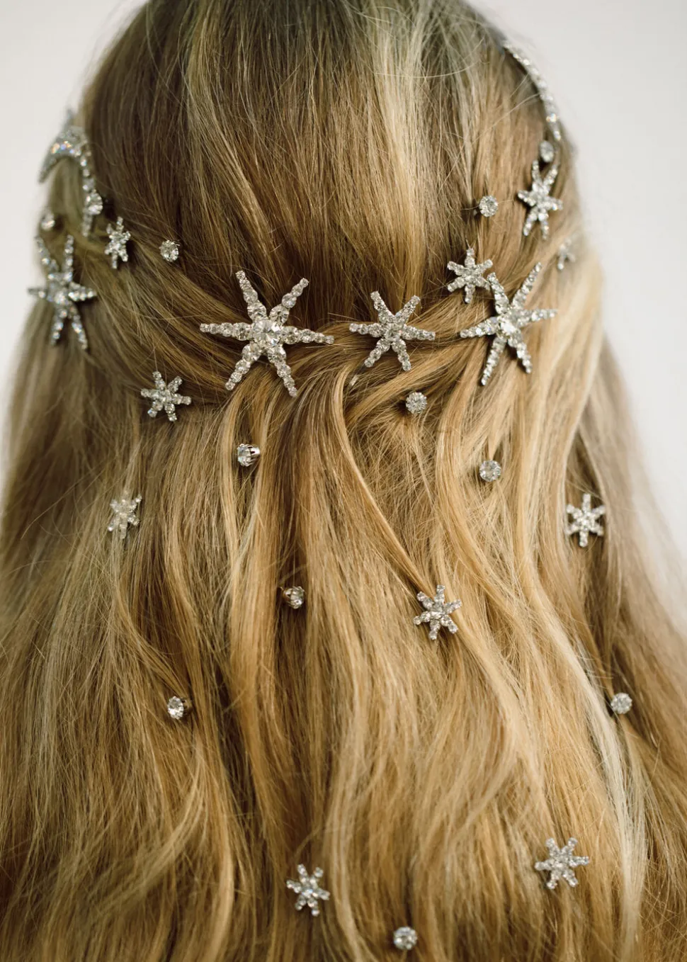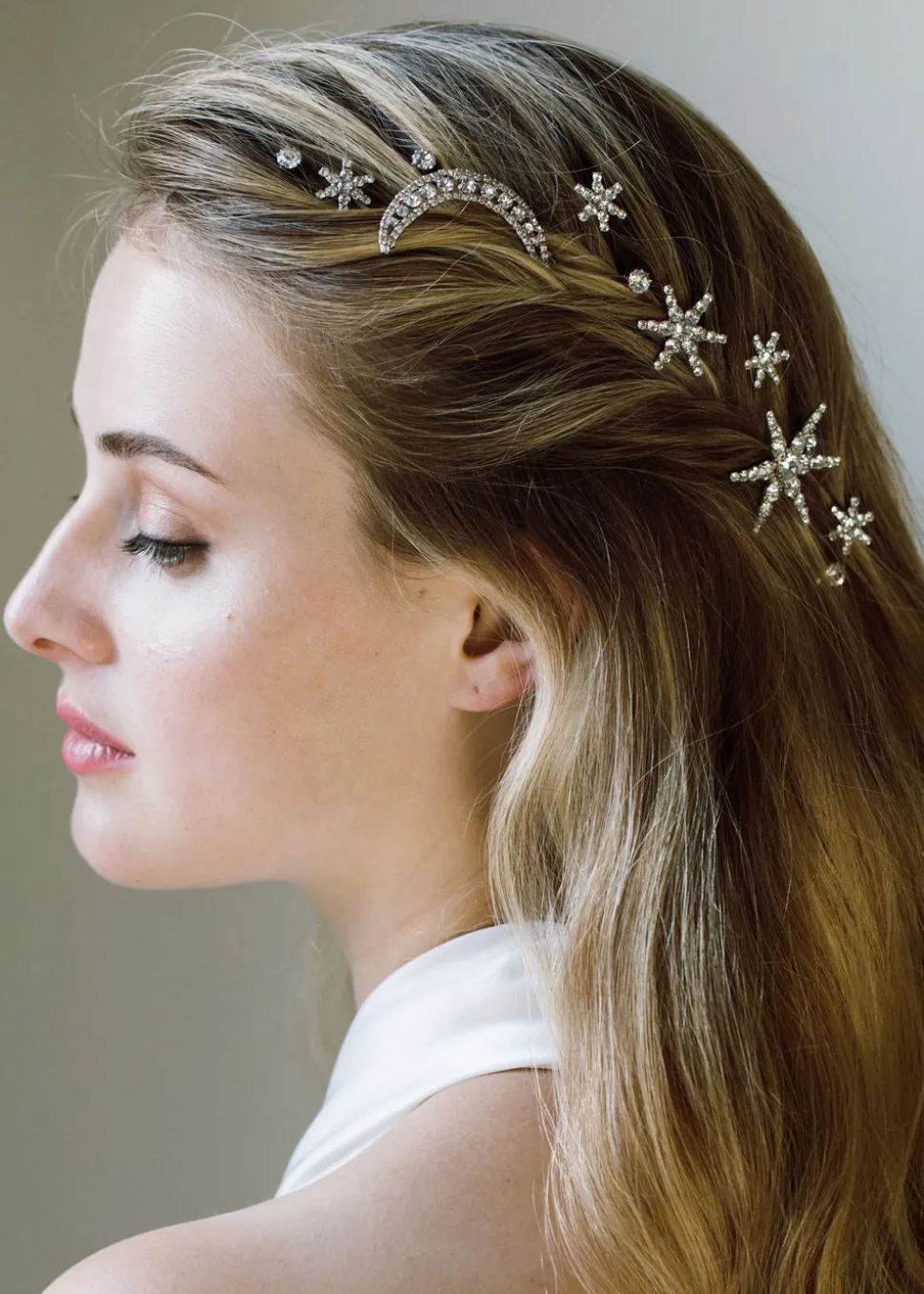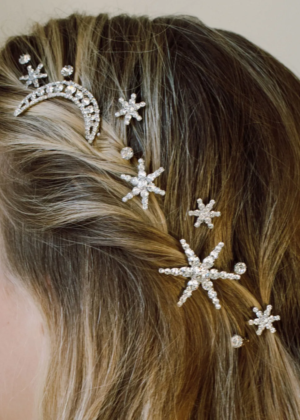 “Everything has a story to tell,” says Jennifer Behr, the founder of her namesake luxury hair accessory brand that has blossomed into one of New York City’s foremost ateliers for jewelry, as well as bridal. In every crystal, pearl, and ribbon, you’ll find the utmost quality and a sense of romance, as each piece reveals a modern interpretation of centuries-old regalia. The Supernova Bobby Pin Set honors the magic of the cosmos, with 12 shining Swarovski crystal stars, moons, and tiny planets. A celestial celebration, with you at the center.
