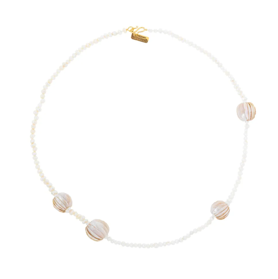 Founder Montserrat Álvarez marries the traditional craftsmanship of coastal Spain and Portugal to a modern sensibility with handwoven reeds, local leatherwork, and porcelain fetiches of the brand’s beach-to-city bags and unique accessories. The Susane Necklace is a timeless adornment rooted in heritage and rare artistry. Handcrafted by José Luis—the only artisan in O Grove still practicing this 19th-century technique passed down from his father—each piece is a quiet celebration of generational knowledge. Composed of nacre beads and baroque pearls, this necklace evokes the beauty of the sea and is finished with gold-plated 925 sterling silver hardware, including a custom tag, ring, and S-hook clasp. A true heirloom, the Susane Necklace is a wearable keepsake of artisanal devotion.