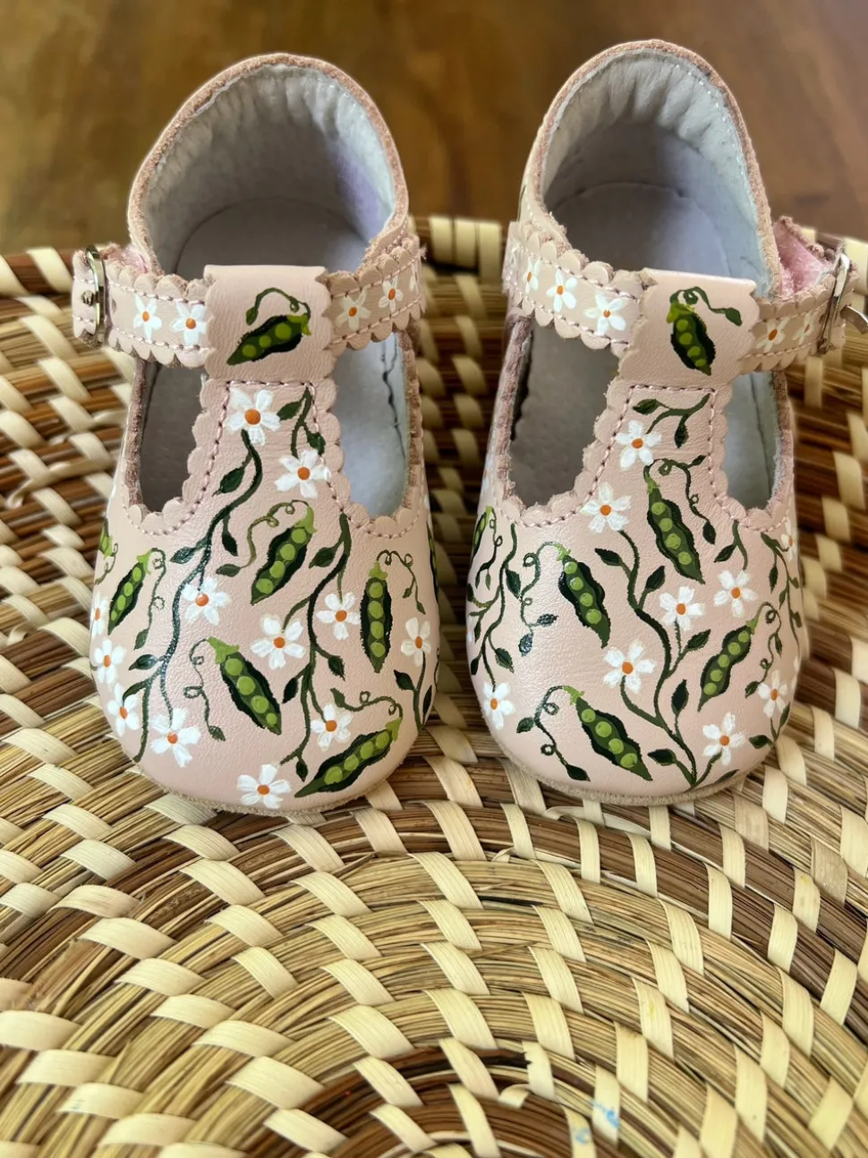 Napa leather. Hand-painted sweet pea and white flower motif. Scalloped detail with Velcro closure and buckle accent. Soft suede soles. Made in the USA.