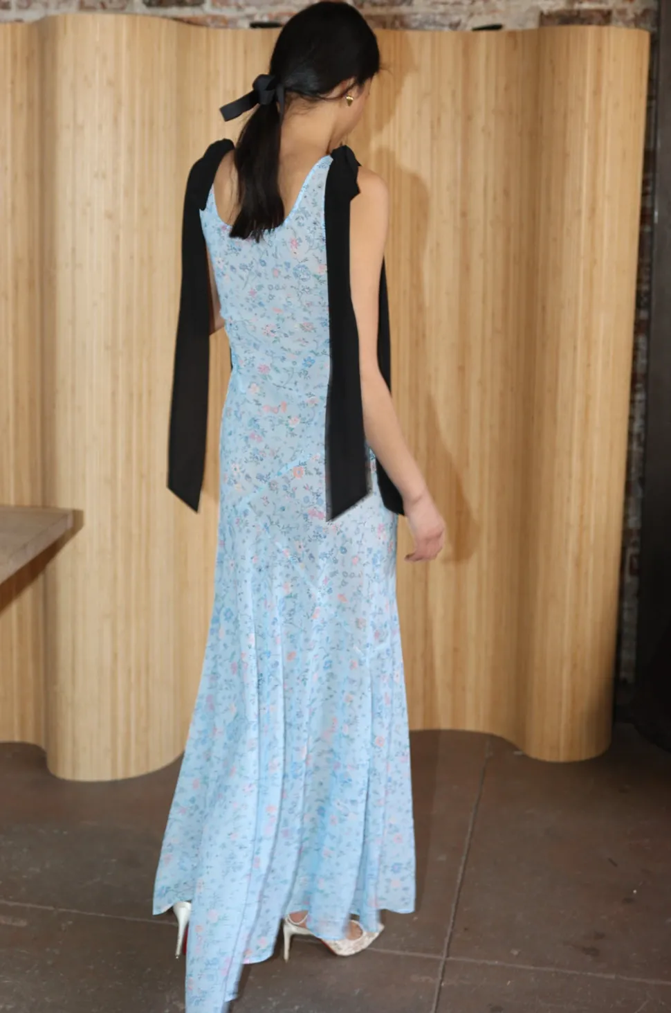Lightweight floral fabric, fully lined. Fitted bodice with flared maxi skirt. Fixed large black ribbon bows add elegant contrast.