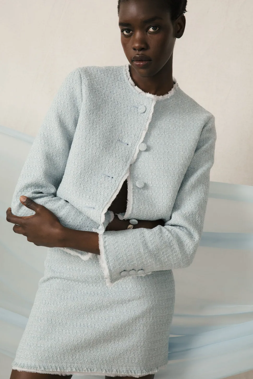 Designed and made in the heart of New York’s Garment District, Lesea Berry draws inspiration from Victorian romanticism, interiors, gardens, and the dynamism of the city itself for the nostalgic beauty of her uniquely luxurious line of womenswear. Each piece is made-to-order, reducing waste, ensuring fit, and asserting an individuality matched only by the women who wear them. Crafted in a sophisticated tweed Sydney Skirt in Blue Tweed is a playful mini that easily balances style and comfort. Pair it back to the Clara Blazer in Blue Tweed for a matching set.