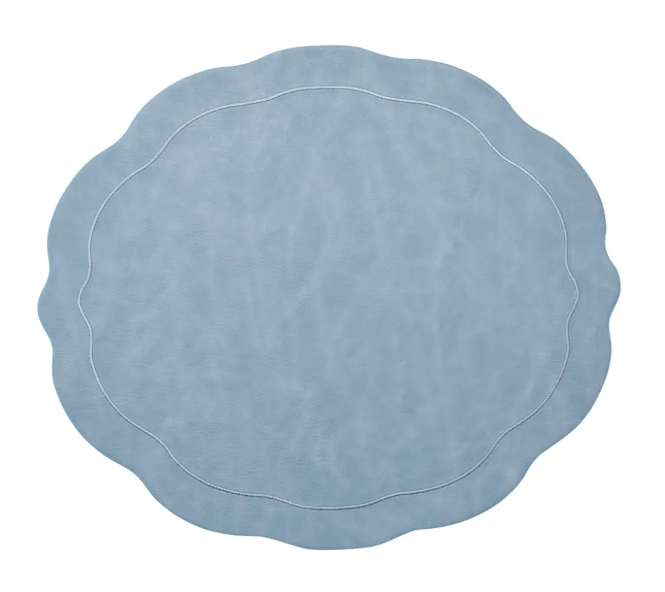 Kim Seybert designs artisan-made tabletop decor and luxury home accessories. Create a well-dressed dining look with the brand’s range of elegant tableware, placemats, runners, chargers, plates, napkins, flatware, and more. The traditional oval shape gets a modern refresh with the matte faux leather Tailored Placemat in Periwinkle, Set of 4. A stylish wavy edge and embroidered tone-on-tone border detailing elevate this faux leather accessory. This hard-backed, versatile placemat is available in a variety of colors.