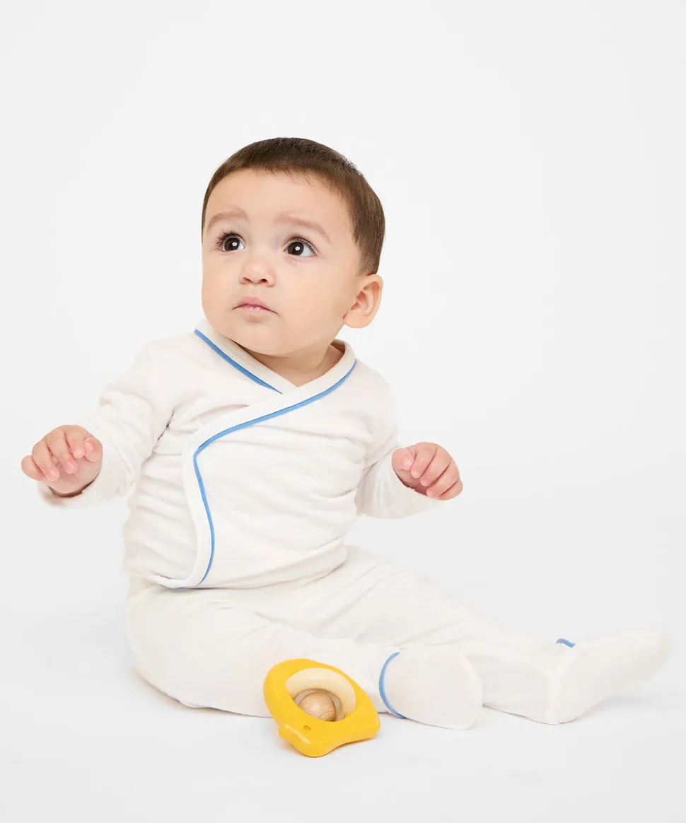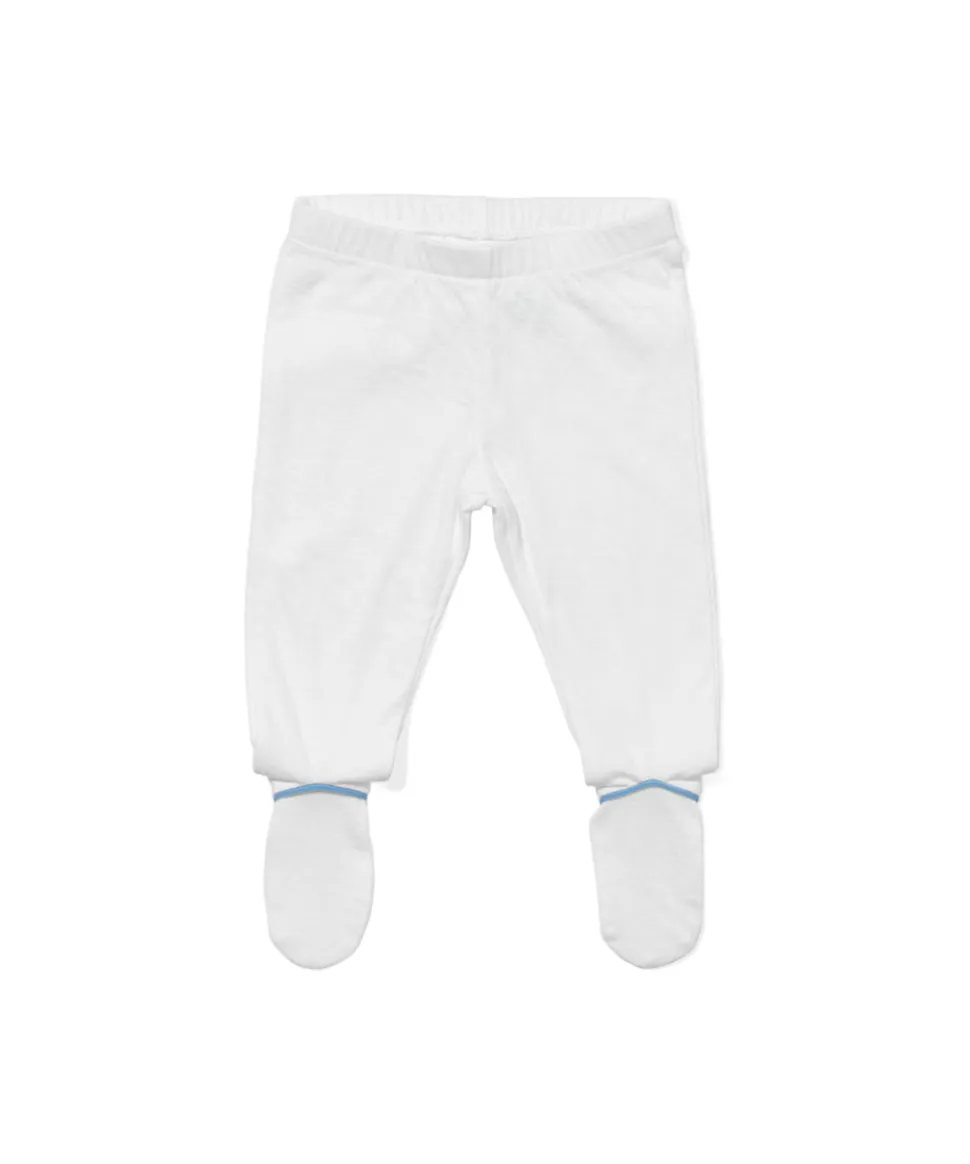 100% organic cotton. Soft and breathable. Built-in footies. Subtle piping at ankle. Easy to mix and match.