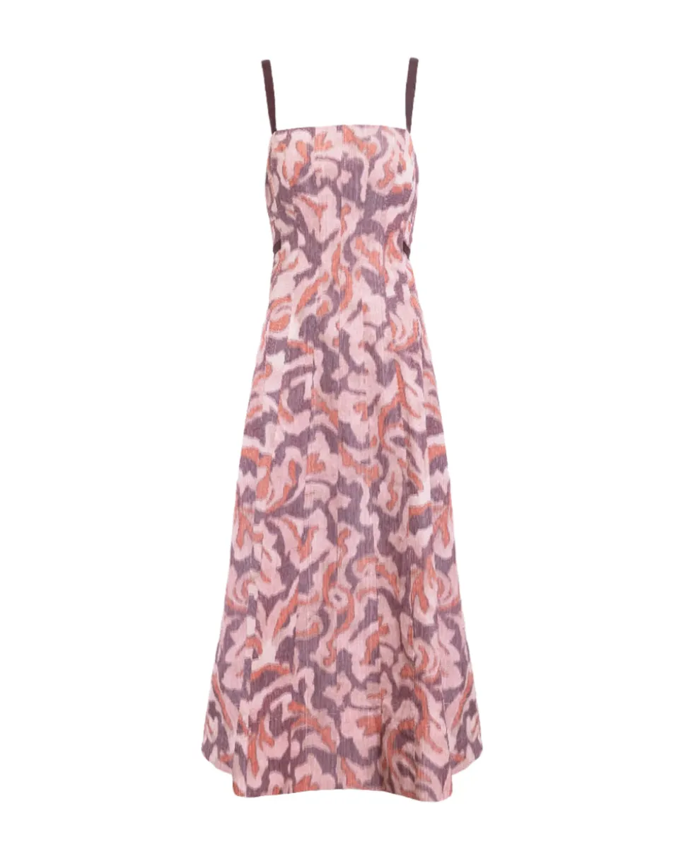 Printed fabric. Midi length. A-line silhouette. Paneled seaming. On-seam pockets. Cinched waist with attached grosgrain ties. Sleeveless. Concealed back zip. Unlined.