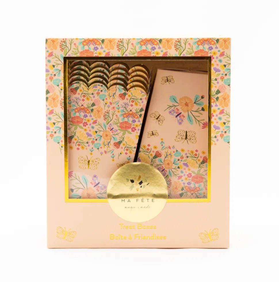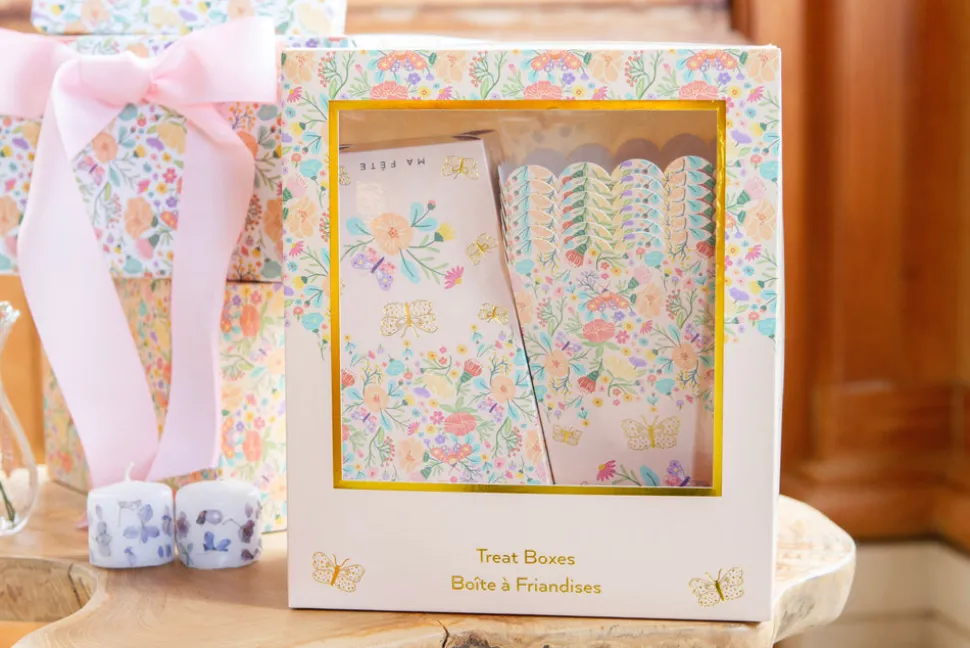 A mom with two young children, Anna Bacon found herself bored with the same old party themes, which is how Ma Fête (“My Party” in French) was born. She creates boxes of matching party materials—plates, cups, napkins and more—with fun, kid-friendly motifs, helping parents throw the most memorable parties, with minimal effort. The Tea Party series adds sophisticated touches to your little one’s elegant celebration. The Tea Party Treat Holders let you keep your sweet treats in paper treat boxes with intricate scalloped edges and gold foil details.