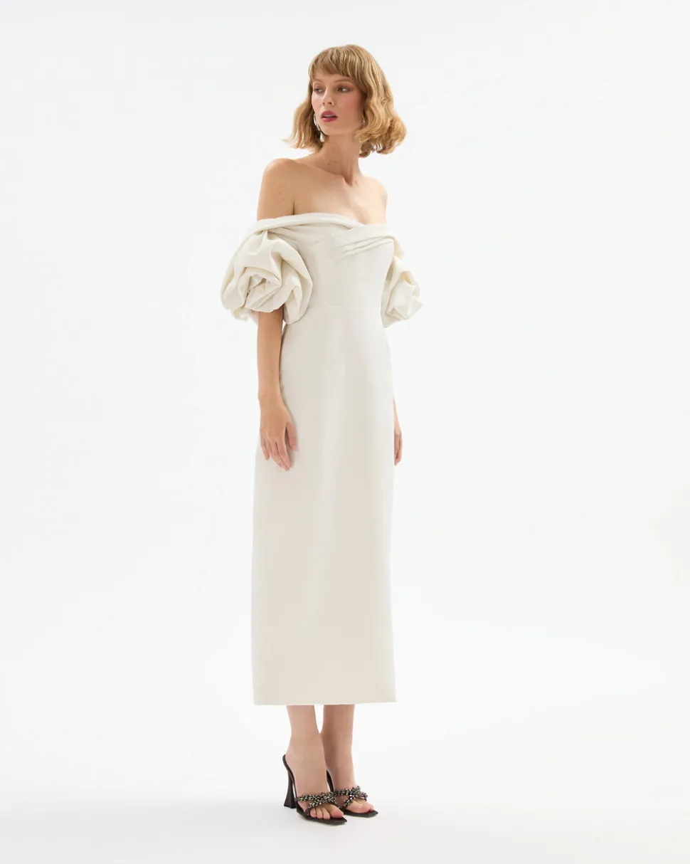 Self: 100% nylon. Lining: 96% polyester, 4% spandex. Midi length. Off the shoulder. Draped puff sleeve. Fully lined. Drapey faille. Internal bustier with boning. Center back vent at skirt. Invisible center back zipper.