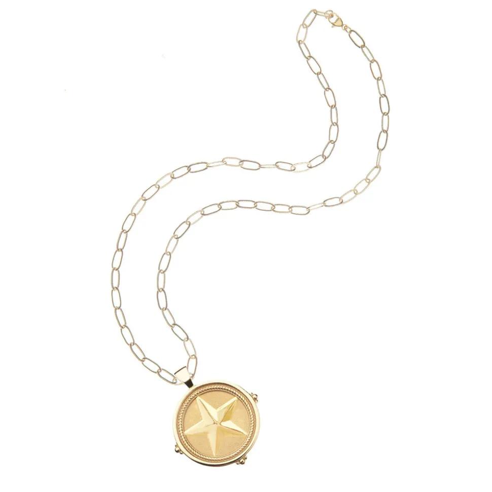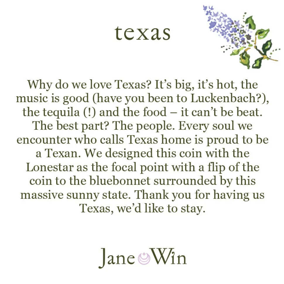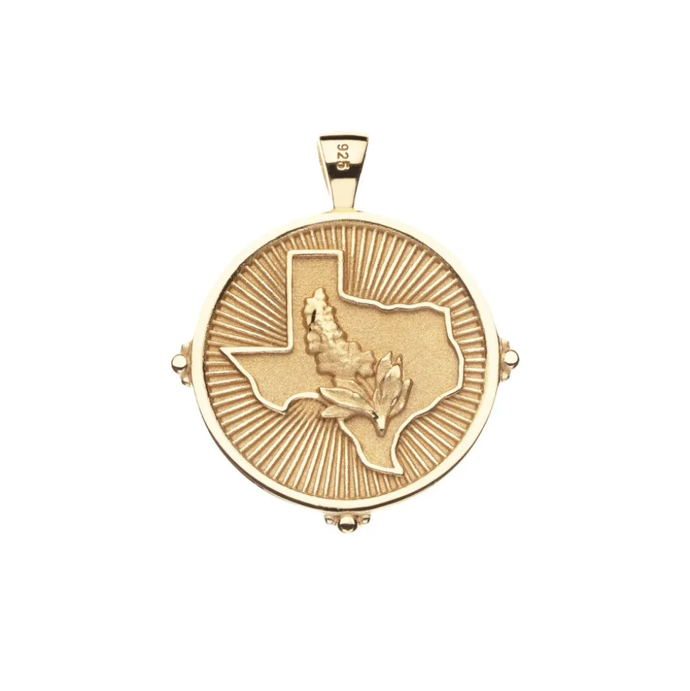 Jane Win’s collection of eight amulets symbolize abundance of positivity, strength, hope and luck, and are shaped to resemble antique coin jewelry. An amazing gift to memorialize milestone moments, or just the perfect eye-catching accessory for a night out, these pieces are worth more than their weight in gold. Bring the independence, lyricism and culture of Texas everywhere with the Texas JW Original Pendant Coin Necklace, featuring the classic Lonestar symbol on one side, and outline of the state on the other. Don’t mess with this necklace!