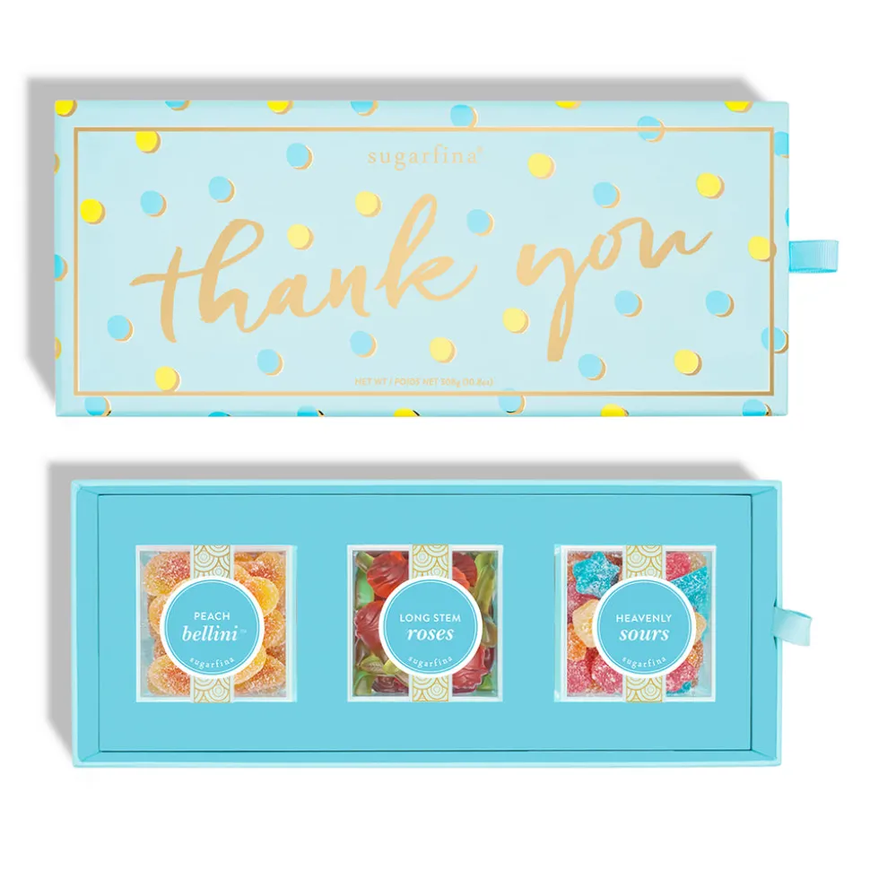 Known and beloved for gourmet confections, Sugarfina travels the world to discover artisan candymakers, infusing them with a luxe, chic, and giftable twist. The Thank You 3 Piece Preset Candy Bento Box is the sweetest way to share your gratitude. This set includes 1 box of Long-Stem Roses (strawberry flavor), 1 box of Peach Bellinis (dusted with sweet and sour crystals), and 1 box of Heavenly Sours (with a sweet finish).