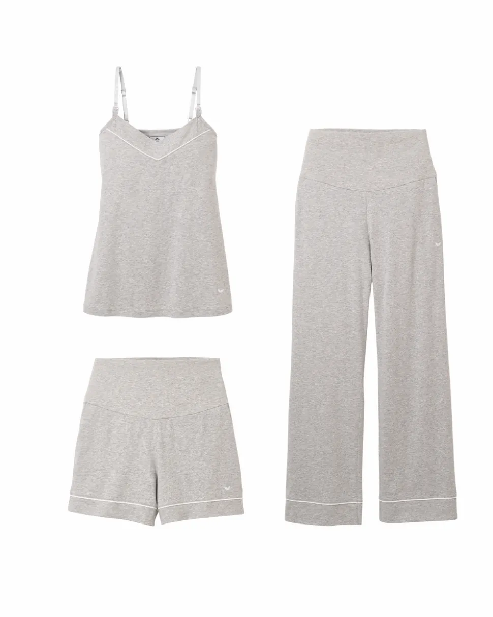 Petite Plume wishes you a “bonne nuit,” and in their luxury sleepwear, it’s hard not to oblige. Crafted from the softest 100% Pima Cotton with a gentle stretch, the Basics Maternity Set in Light Heather Grey includes everything you need for luxurious lounging: a pair of breezy shorts, a versatile cami, and the coziest pants, all designed to accommodate your growing belly with ease.