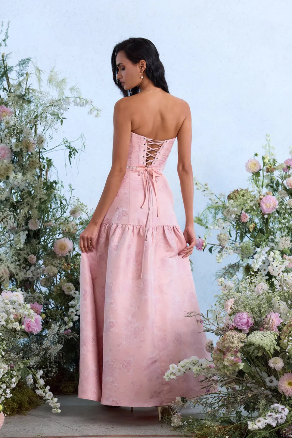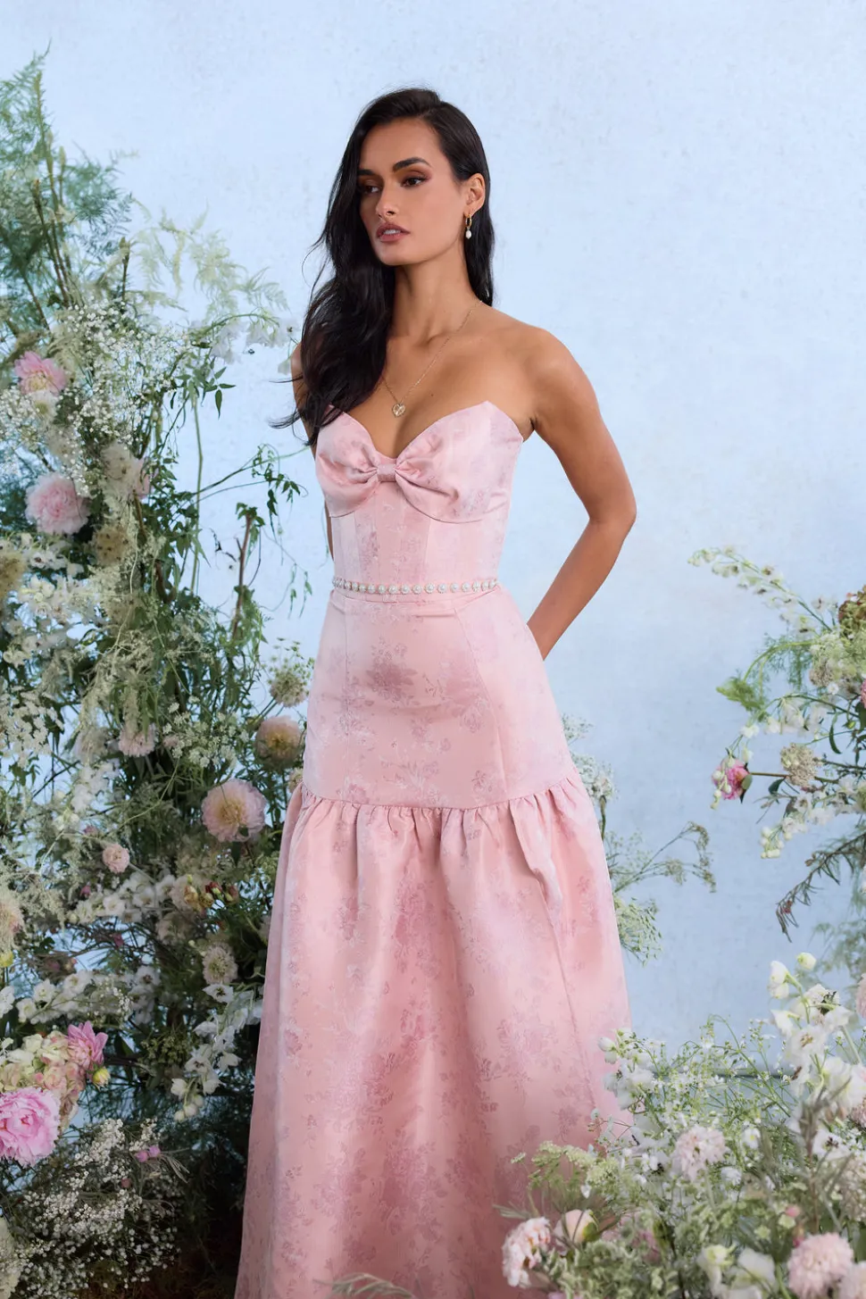 Named for her grandmother, who taught her to sew, Victoria Salisbury founded V. Chapman to bring unique, structured, feminine clothing to a new generation of women. Based in Los Angeles, V. Chapman masterfully updates vintage silhouettes with a modern flair, and contemporary touches. The Beatrice Dress in Light Pink Windsor Brocade is a strapless corset gown with a beautifully gathered bow detail at the bodice. Made from Light Pink Windsor Brocade, this dress features light pink florals on a light pink background. Gorgeously fitted at the hips, it flaunts a delicate, detachable pearl crystal belt to add a little extra sparkle.